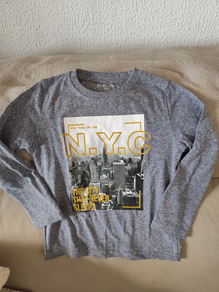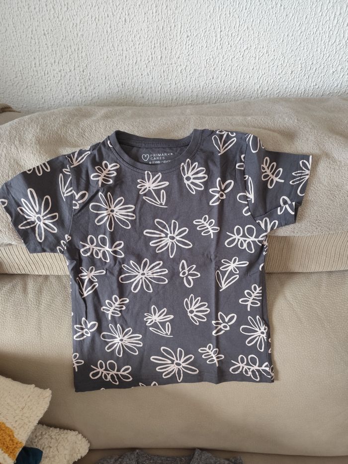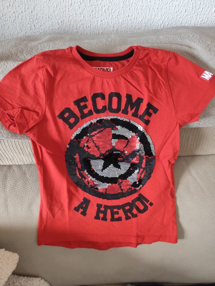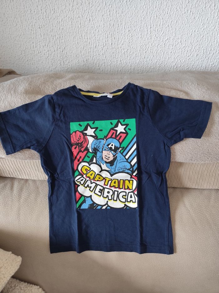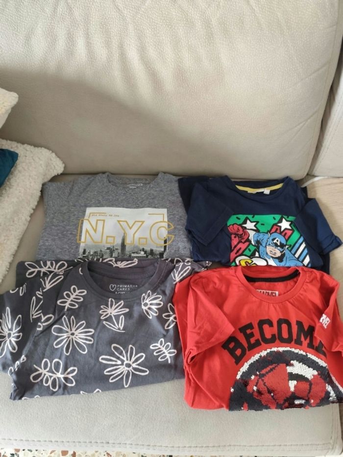 1 tee-shirt manches longues gris in extenso 1 tee-shirt fleuri gris Primark 1 tee-shirt bleu captain american Disney 1 tee-shirt rouge marvel