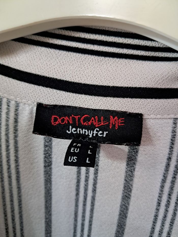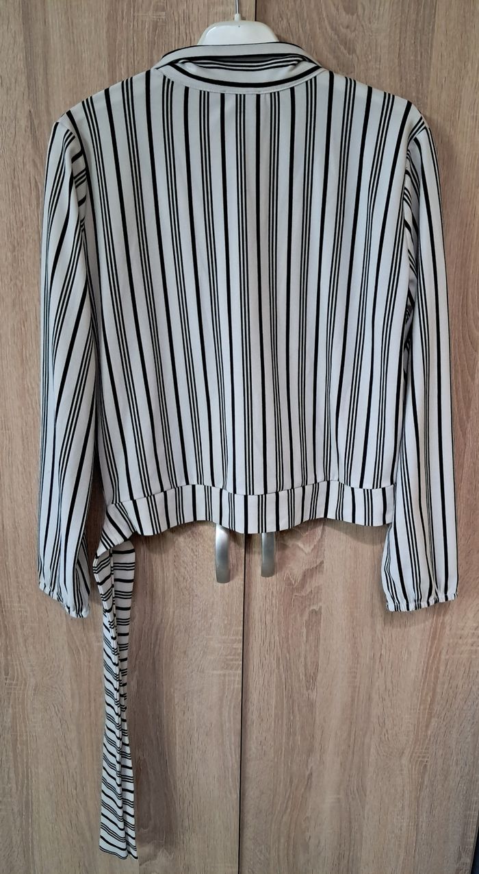 Blouse courte Jennyfer taille L à rayures A nouer sur le côté Élastiqué aux manches Longueur de l'épaule jusqu'en bas 50 cms Étiquette de composition coupée