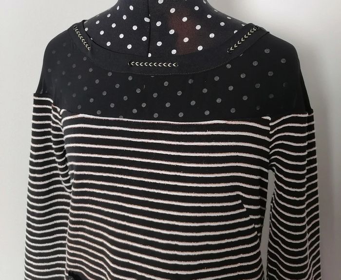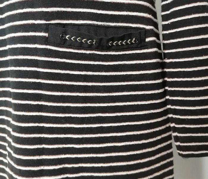 ⏩ Tous mes robes => #bizs33robe ⏩Tous mes articles en taille L de => #bizs33taillel Superbe robe marine Rayures horizontales Manches longues, col rond Couleur : noir et blanc, doré Tissu légèrement extensible Pas de doublure One Step Taille 40 = L Composition : 75% Coton 11% Viscose 10% Métal 4% Polyester Tissu secondaire : 100% Polyester Mesures à plat fermé : Longueur : 88 cm Aisselles : 47 cm Taille : 46 cm Prix d'achat ~ 140€ 🌟 Peu portée, très bon état général 🌟 🎁🎁🎁 Profitez d'un article offert, avec votre commande, voir les détails dans mon 'à propos' 🎁🎁🎁 #fashion #rayures #femme #chic #brillant #noir #blanc #doré #bizs33taille40 #robe #bizs33taillel #bizs33top #bizs33 P20N64