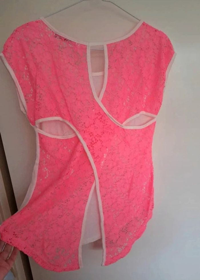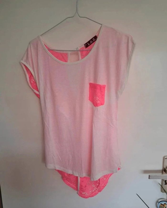 Magnifique t-shirt blanc et rose fluo. Dos croisé et dentelé. Taille unique, n'a pas été porté. Il est fluide et super beau ! Je le vends au prix de 10 euros. #TailleUniquemarine