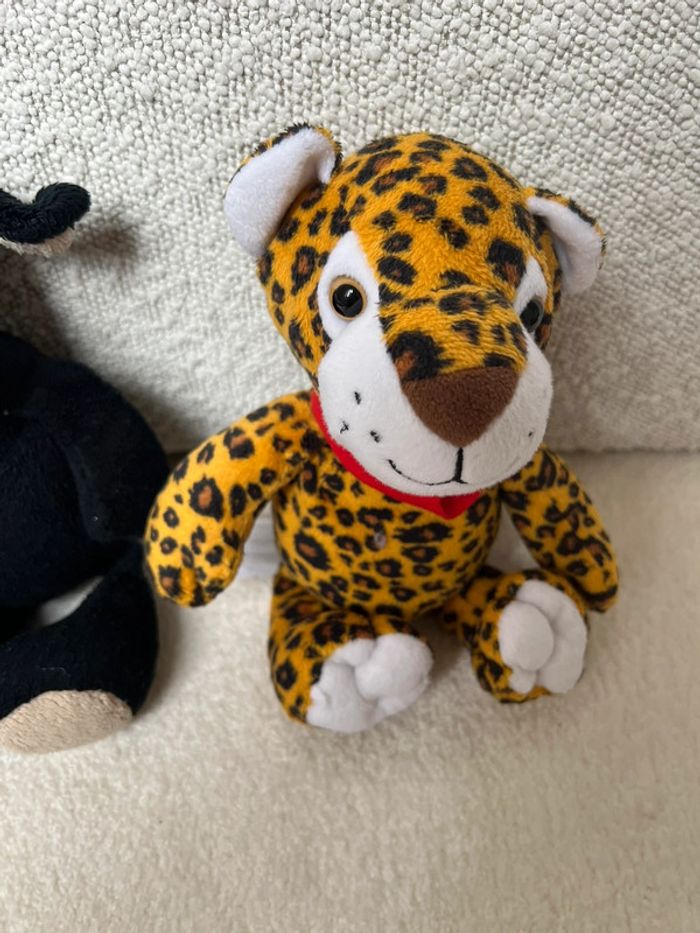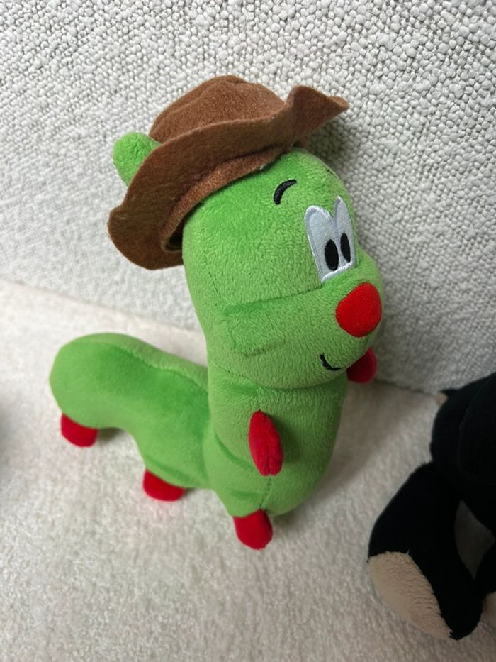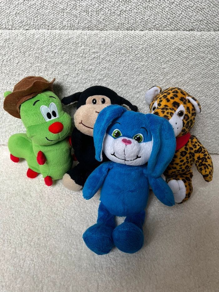 Lot peluches Kinder Lapin bleu, mouton noir, chenille verte et léopard Tbe général #lgtipeluches