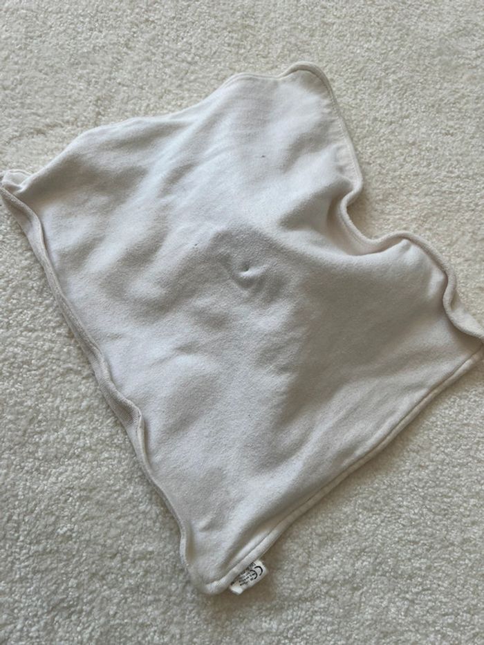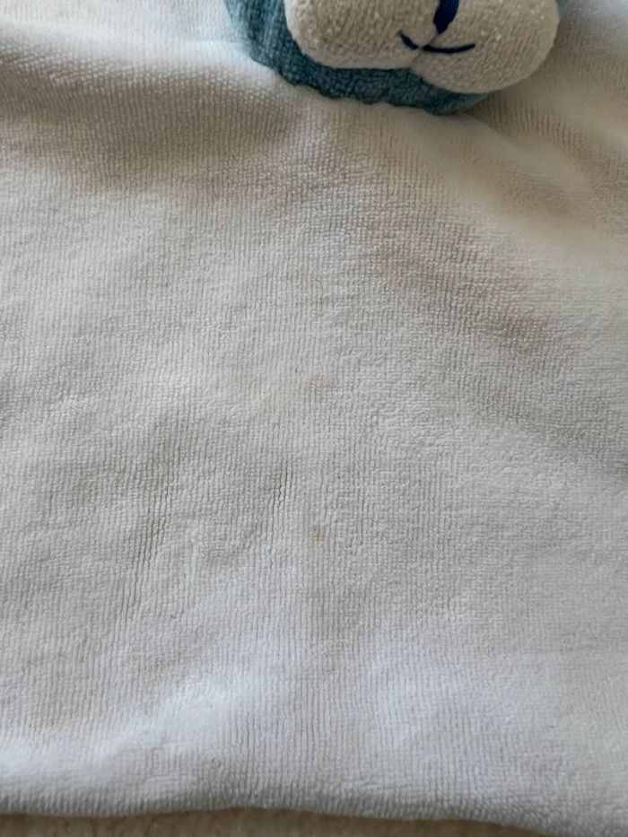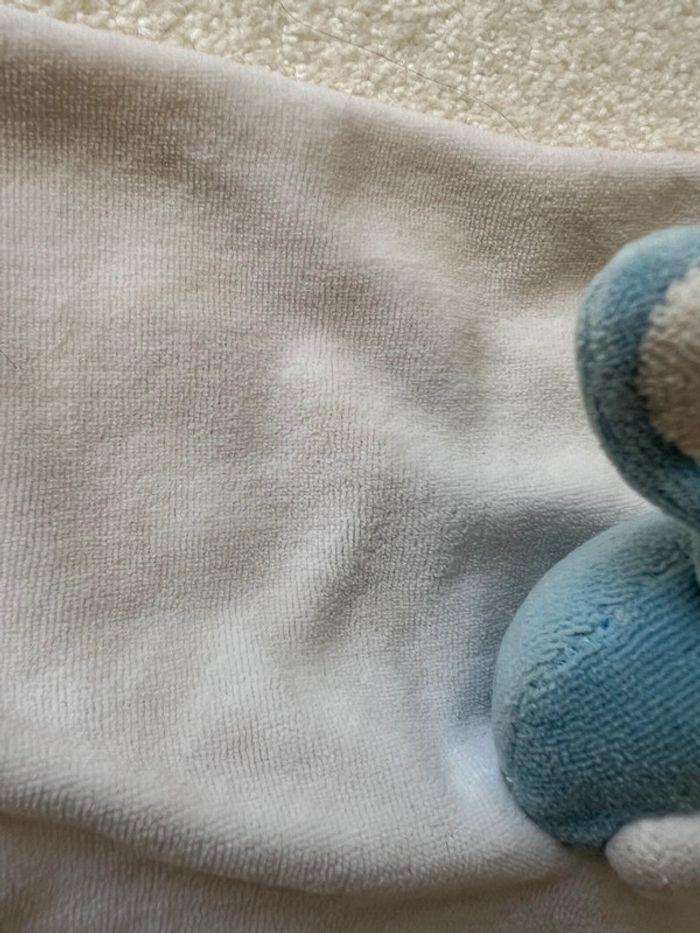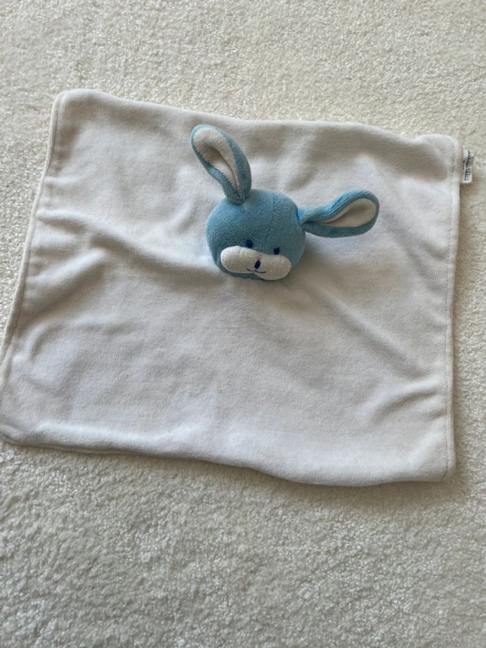 Doudou plat lapin bleu Carré blanc Laboratoire Rivadis Taché sur le verso cf photo #lgtipeluches #lgtidoudou #lgtidoudouplat #lgtilapin