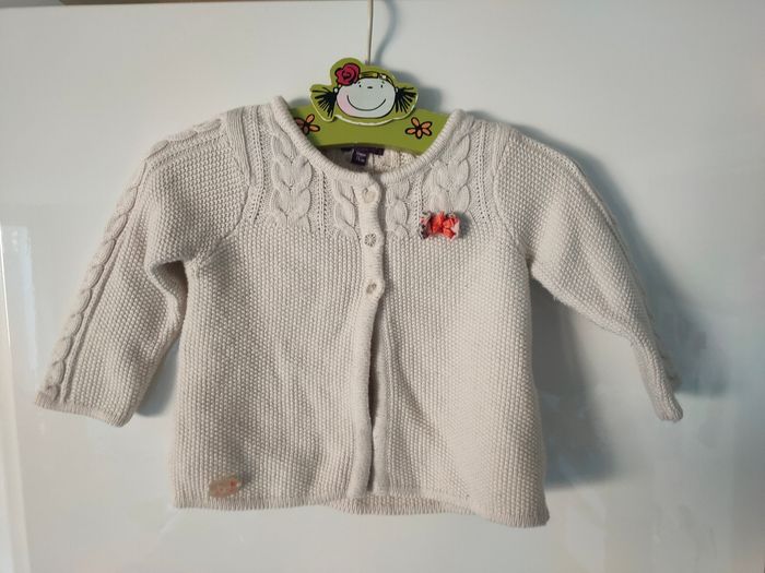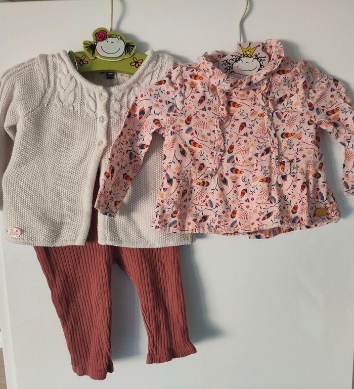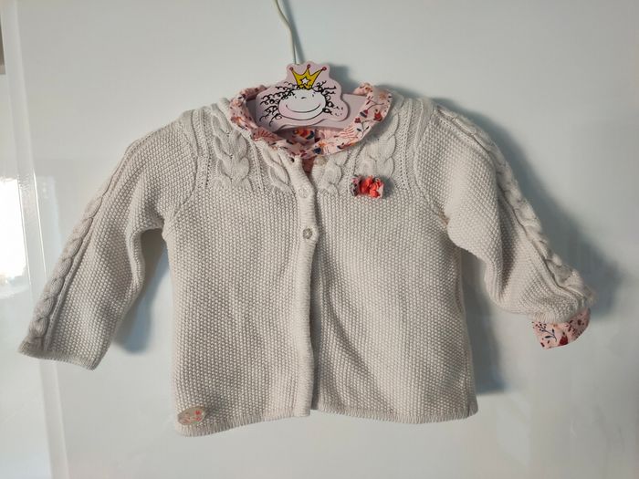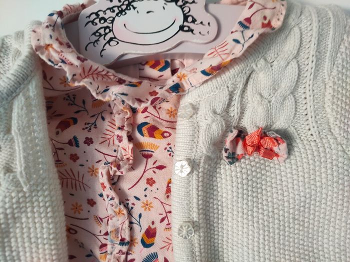 Joli petit ensemble chic Serjent Major idéal pour ce printemps 🌸 Gilet en maille torsades, coloris crème assorti à sa jolie blouse à col imprimé fleuri liberty 🌺 Portée une seule fois ! J'ajoute un legging en maille coton côtelée coloris framboise. Taille 12 mois