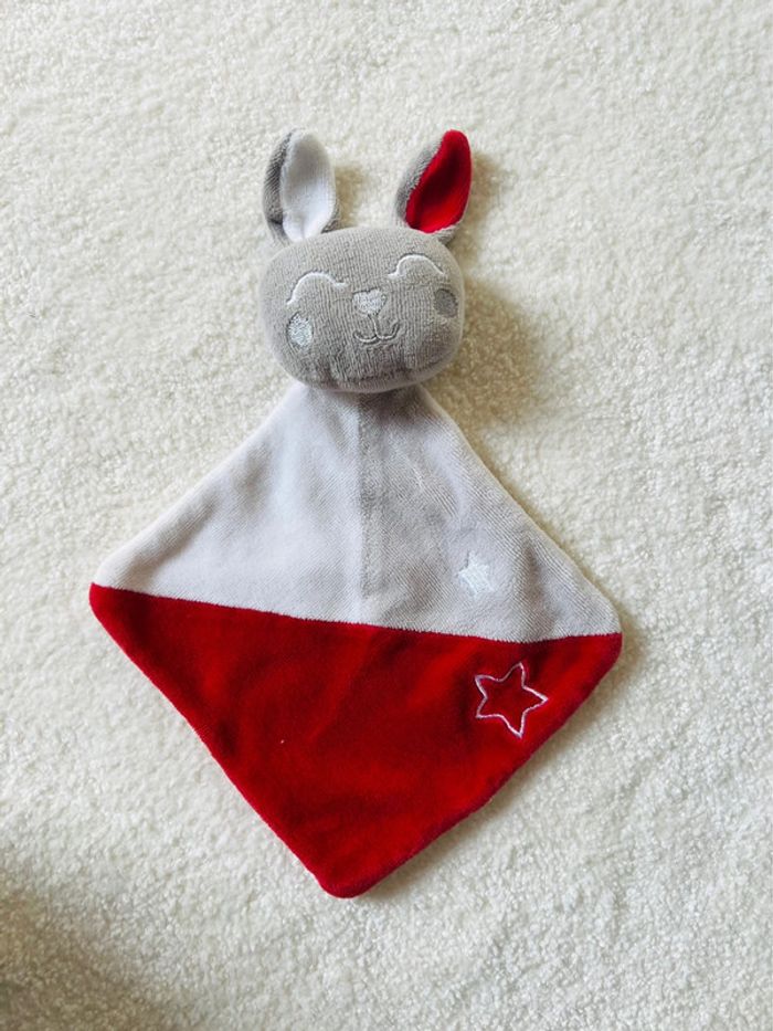 Doudou plat lapin gris et rouge Leclerc