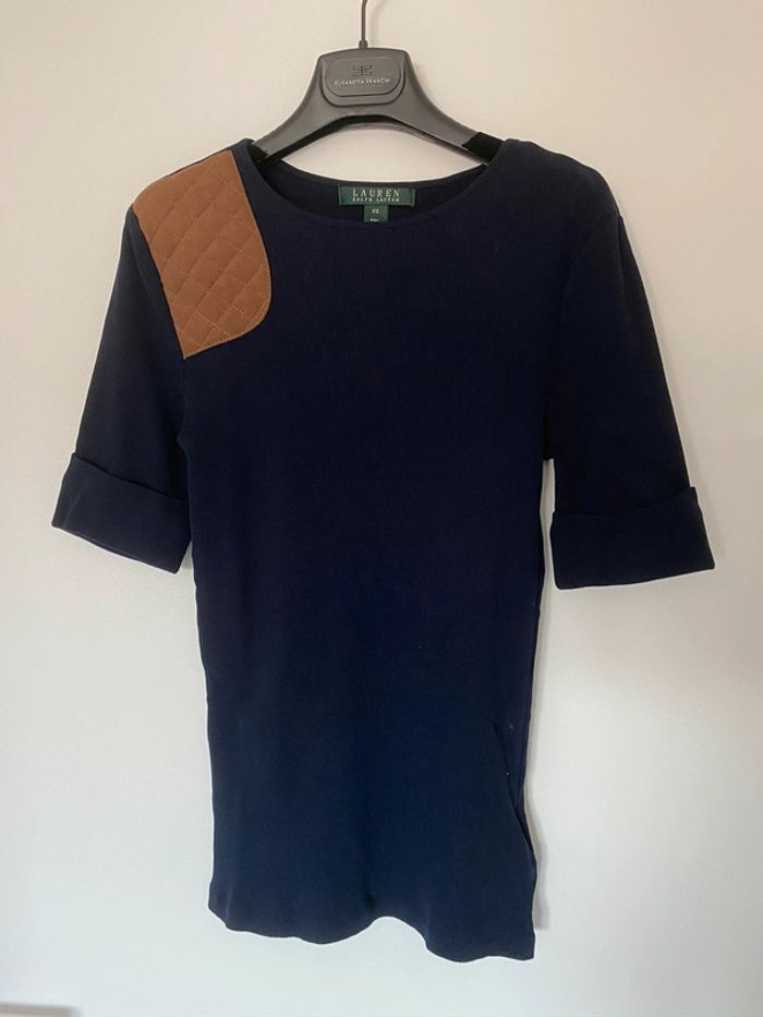 #lgtixs Pull marine manches courtes Ralph Lauren XS comme neuf ! empiècement camel sur l’épaule D
