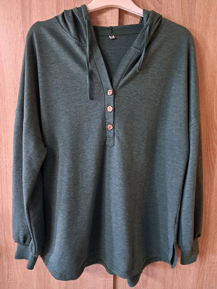 Sweat à capuche Oversize taille M vert foncé Lacet à la capuche Boutonnière à l'avant Bouloche légèrement