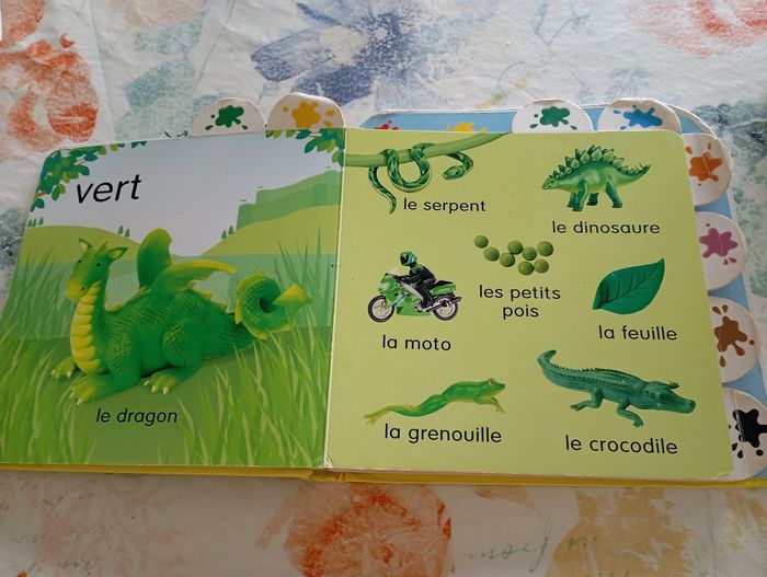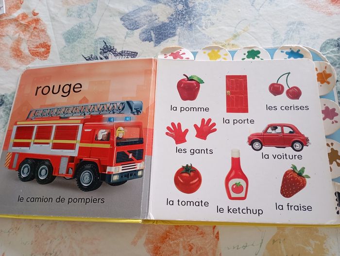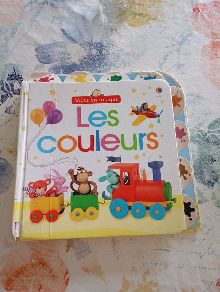 Livre pour apprendre les couleurs et les objets.tres bon état en carton très épais couverture un peu usée Une grosse locomotive bleue, des petits chaussons roses... Les très jeunes enfants s'amuseront beaucoup à chercher et à nommer les objets et animaux présentés dans ce livre tout-carton très coloré.