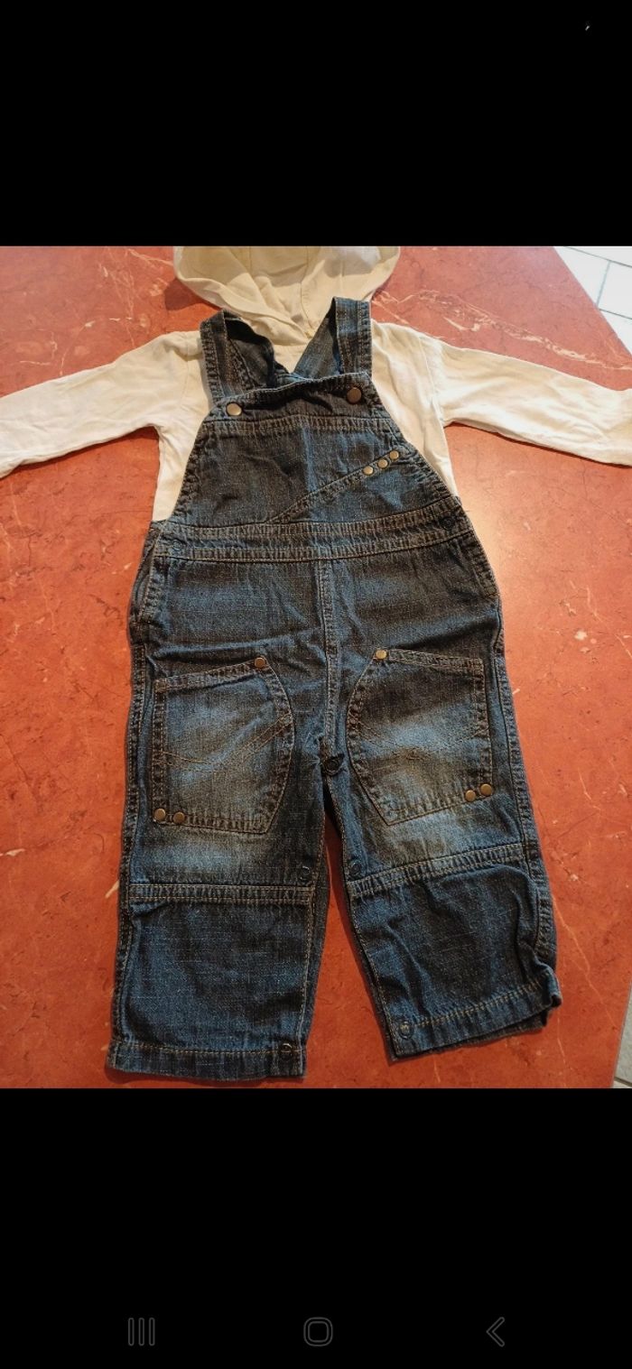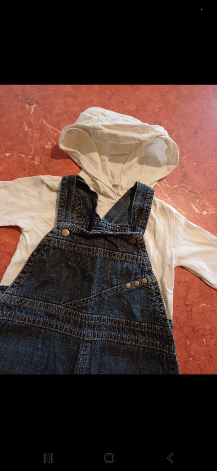 Ensemble comprenant une salopette réglable au niveau des bretelles, pressions à l entrejambe et un T.shirt manches longues avec capuche