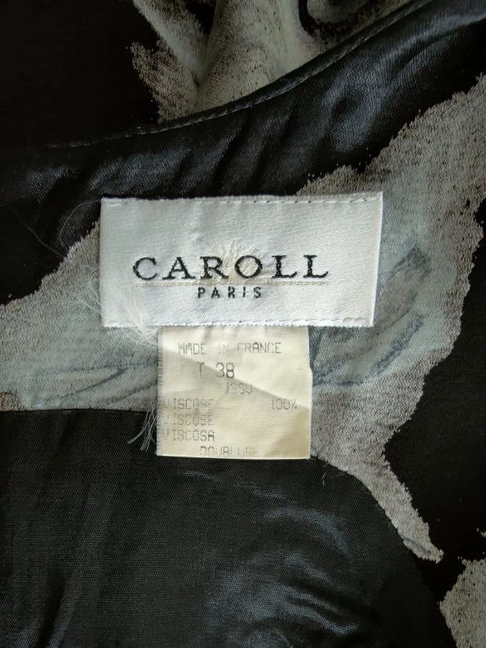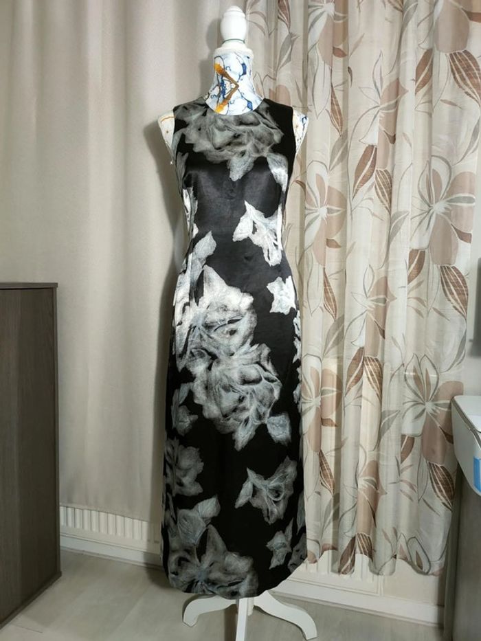 longueur 120 cm Apportez une touche d'originalité et d'élégance à votre garde-robe avec cette robe Caroll vintage. Son motif floral gris sur fond noir, sa matière fluide et confortable en viscose (100%), sa coupe droite flatteuse et sa longueur midi en font une pièce idéale pour un look chic et graphique. Parfaite pour une occasion spéciale ou pour rehausser une tenue de soirée.