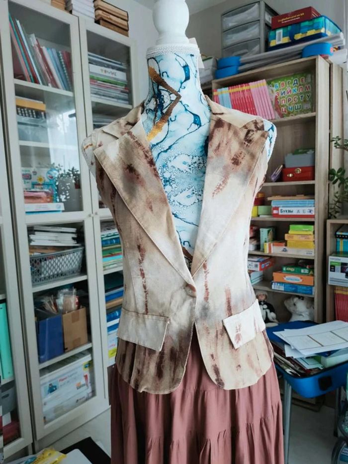 Apportez une touche d'originalité à votre garde-robe avec cette veste sans manches. Son imprimé tie and dye beige et marron, sa coupe tailleur et ses détails poches lui confèrent un style bohème chic unique. Parfaite pour une occasion spéciale ou pour rehausser une tenue classique, elle se mariera facilement avec une jupe, un pantalon ou une robe.