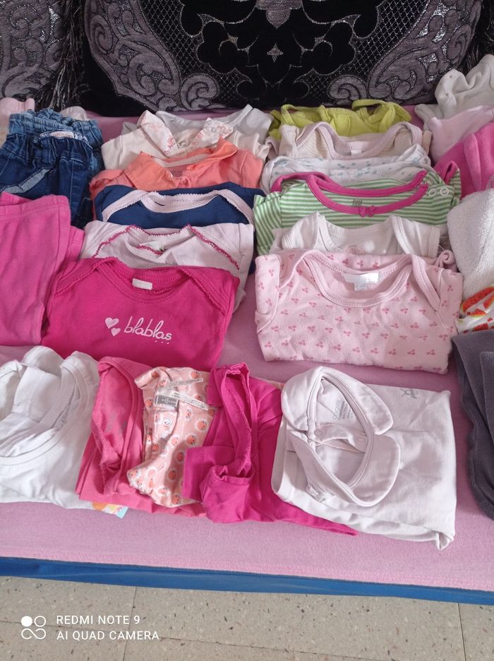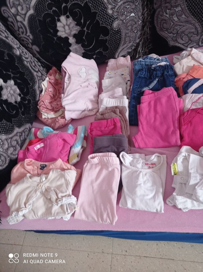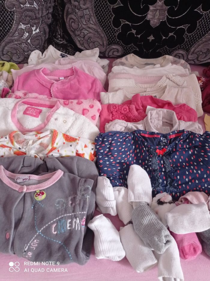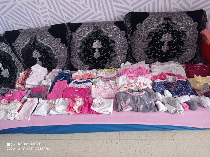 Bonjour Vend gros lot fille 9 mois Très bon état voir état neuf pour certains vêtements Ni trou ni tâche Comprend: 4 pantalons 9 leggings 7 hauts 6 pyjamas 6 bodys MC 6 bodys ML 6 t-shirts MC et 1 ML 4 gilets 1 salopette Un ensemble pull + pantalon 14 paires de chaussettes Un ensemble t-shirt + short 5 robes 3 mateaux Le tout lavé, propre et entretenu