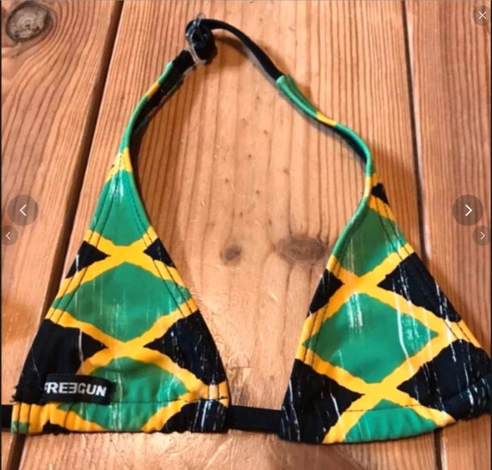Très joli maillot 2 pièces 4/5 ans très peu porté les traits blancs ne sont pas un défaut ni un produit usé le maillot de bain est fait ainsi