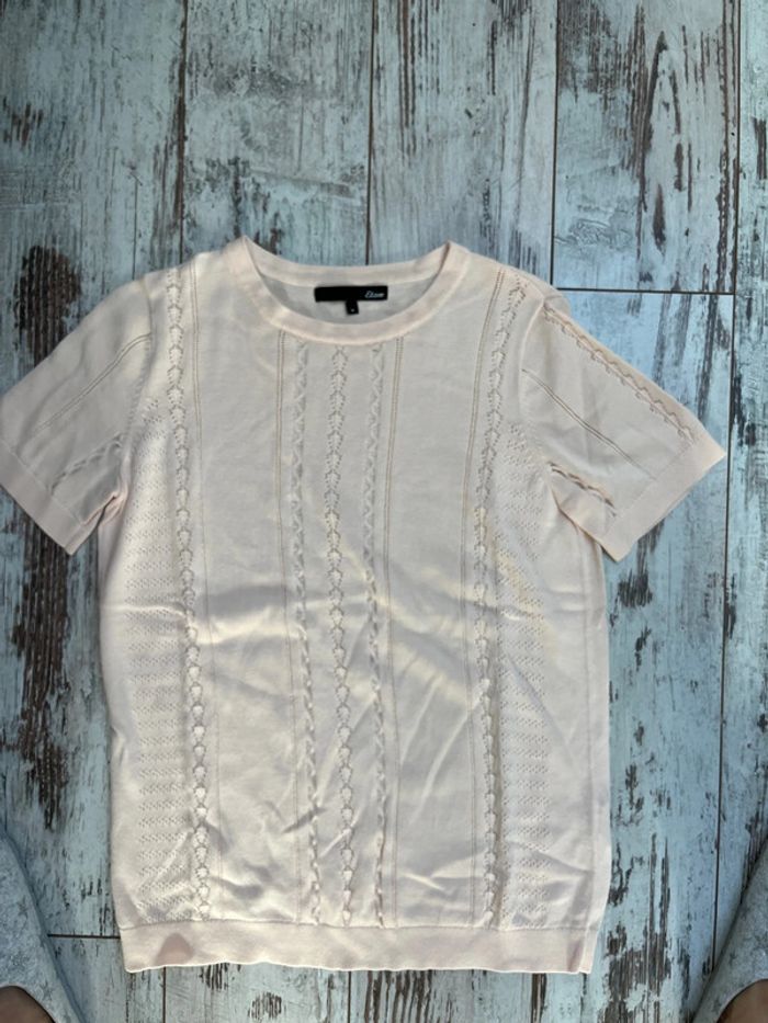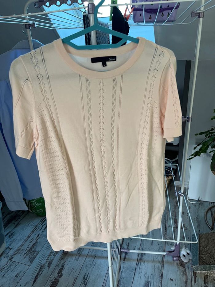 Joli top Etam. Léger. Porté 1 fois mais trop cintré pour moi Longueur 63 cm Largeur aisselles 49 cm Longueur manches courte 22 cm Largeur épaule 38 Largeur base 43 cm Convient pour un 40
