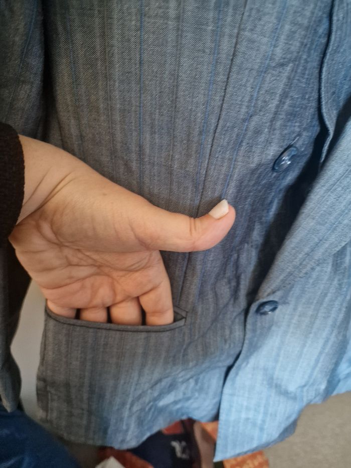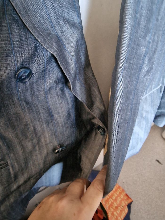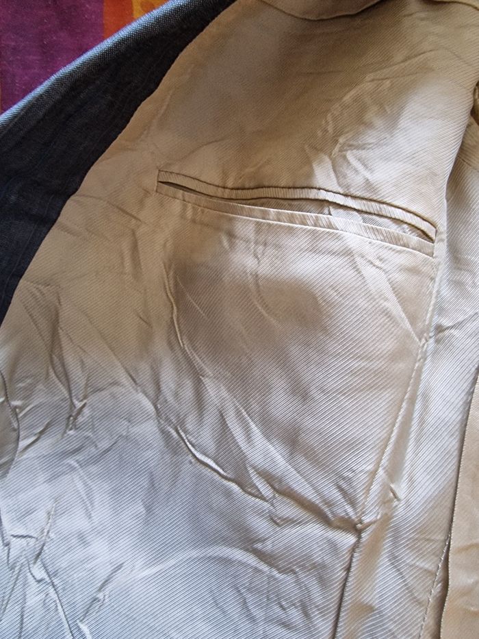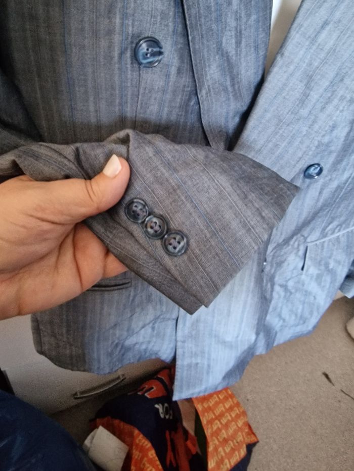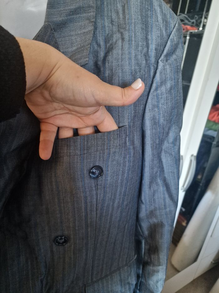 Cette jolie veste a la texture satinée, et aux rayures verticales vous apportera élégance et une note d'originalité par sa fermeture à double jeu de boutons. Jeux de poches impressionnant avec ses 3 poches extérieures et 4 intérieures. Taille 25 correspondant à un 46 Mesure aisselles 58cms a plat Hauteur 73cms Je n'ai pas remarqué d'anomalie