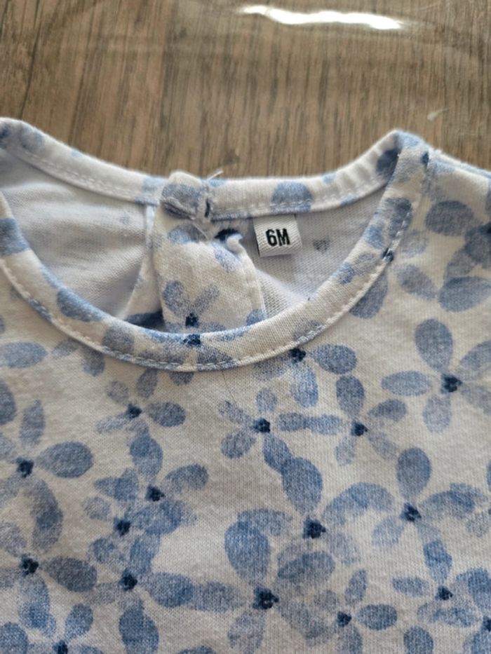 Ensemble tee shirt blanc avec fleurs bleu et leggings bleu marine Taille 6 mois Bon état