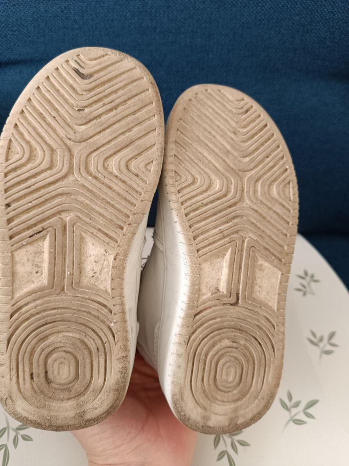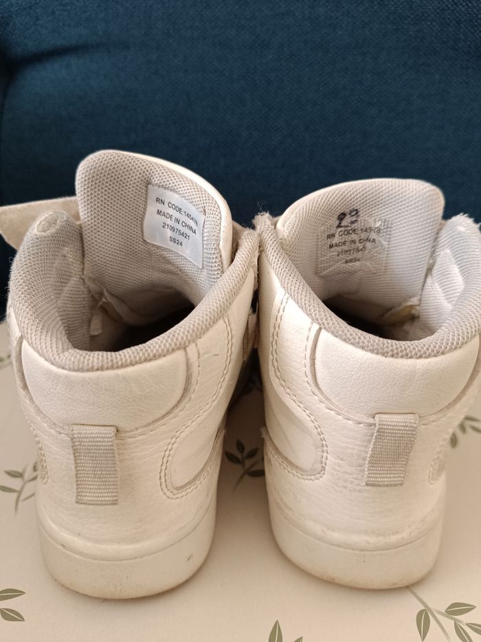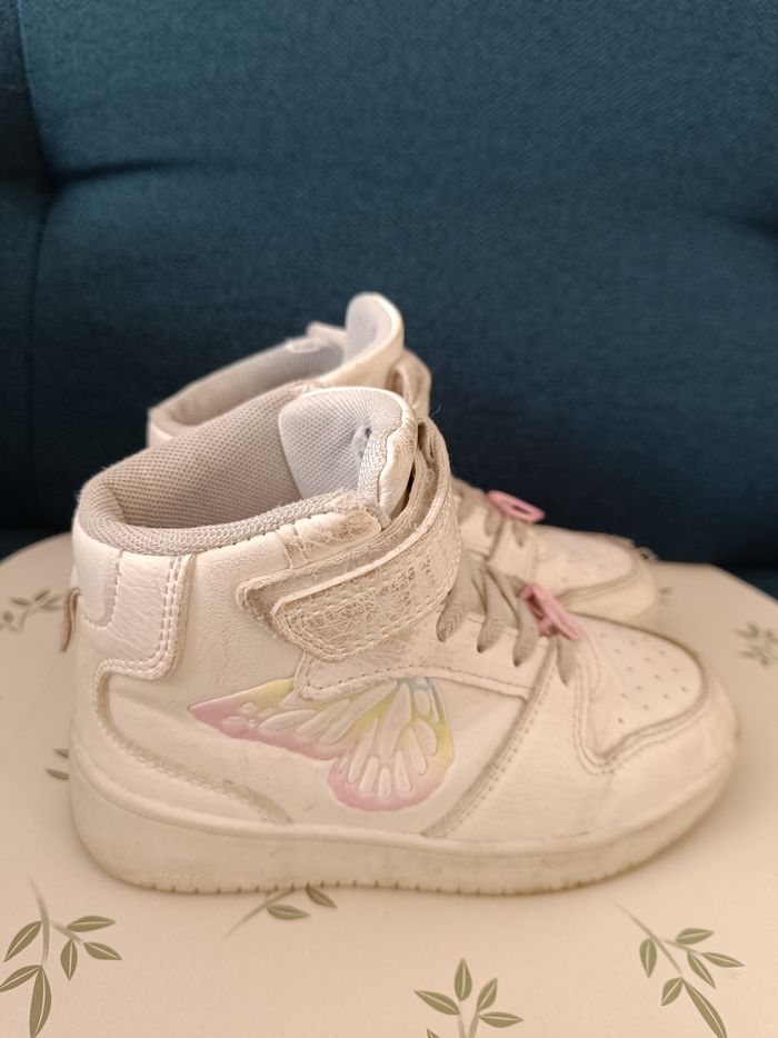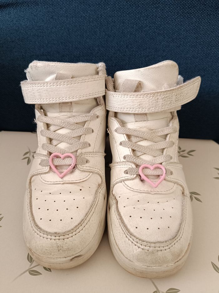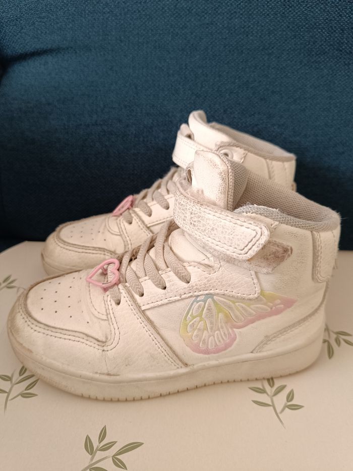A vendre : Une paire de baskets montantes. Couleur : Blanc. Motifs : Papillon pastel est visible sur le côté, avec de petits cœurs roses sur les lacets. État : Bon état, Les chaussures présentent de légères marques d'usure.
