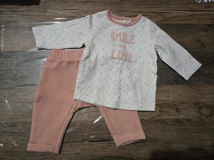 Ensemble pantalon rose et tee shirt manches longues blanc à pois rose Taille 3 mois Bon état