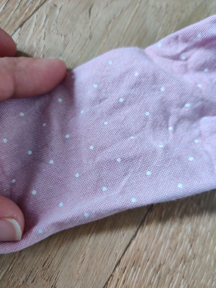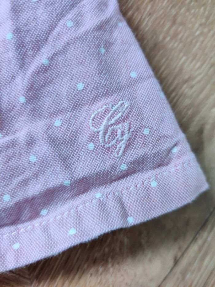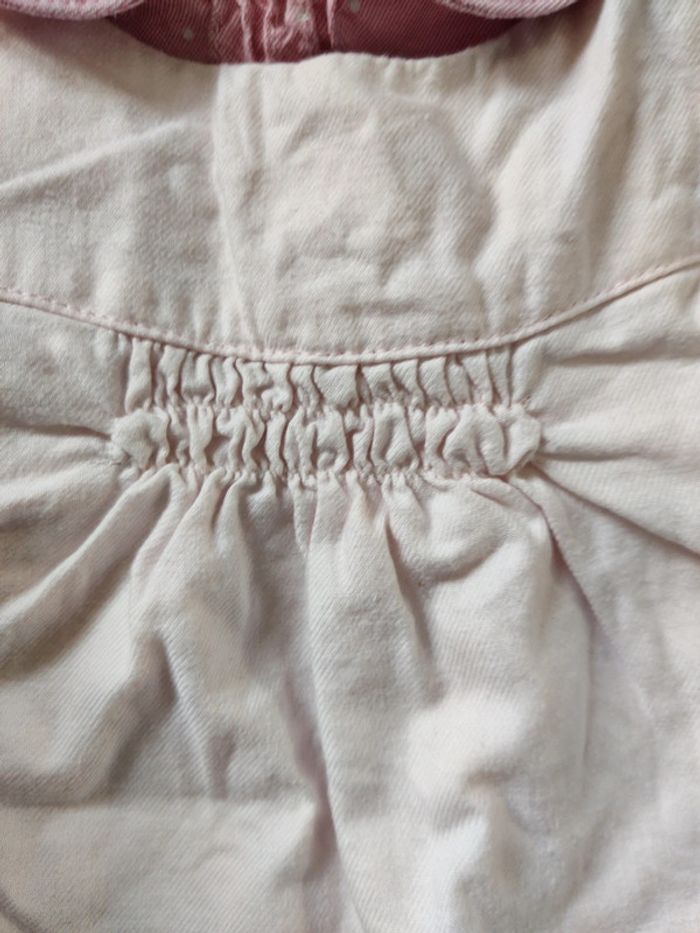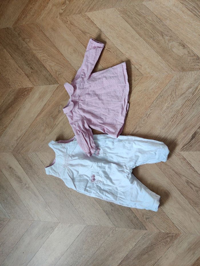 Ensemble 2 pièces cyrillus salopettes rose avc nœuds sur poches et mini smock + chemisier rose à pois portée mais bon état général