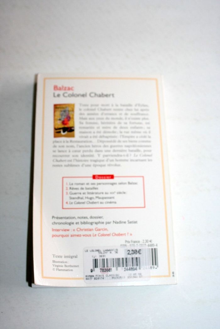 Le Colonel Chabert de Balzac éditions GF Flammarion, 4ème de couverture un peu pliée, 200 pages, 180g Tenu pour mort à la bataille d'Eylau, le colonel Chabert rentre chez lui après des années d'errance et de souffrance. Mais aux yeux du monde, il n'existe plus. Sa femme, héritière de sa fortune, est remariée et mère de deux enfants ; sa maison a été démolie ; la rue même où il vivait a été débaptisée : l'Empire a cédé la place à la Restauration... Dépossédé de ses biens comme de son nom, l'ancien héros des guerres napoléoniennes se lance à coeur perdu dans une dernière bataille, pour recouvrer son identité. Y parviendra-t-il ? Le Colonel Chabert est l'histoire tragique d'un homme incarnant les restes sublimes d'une époque révolue.