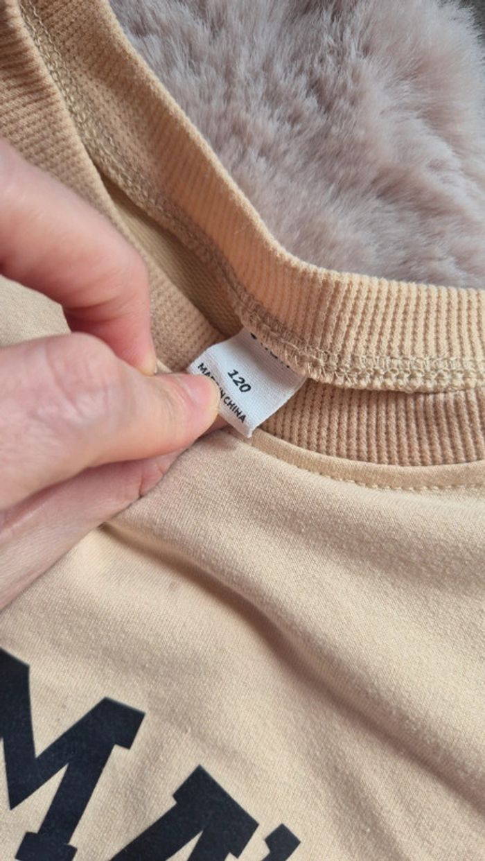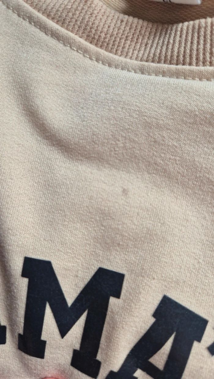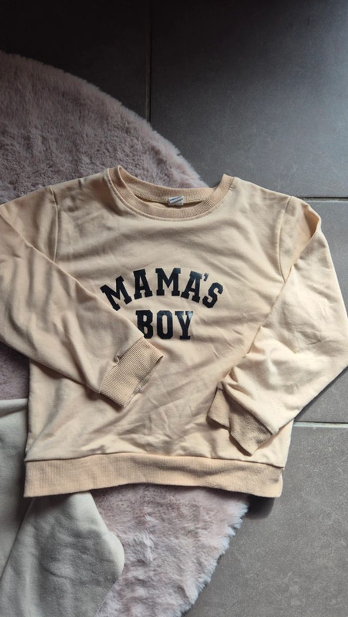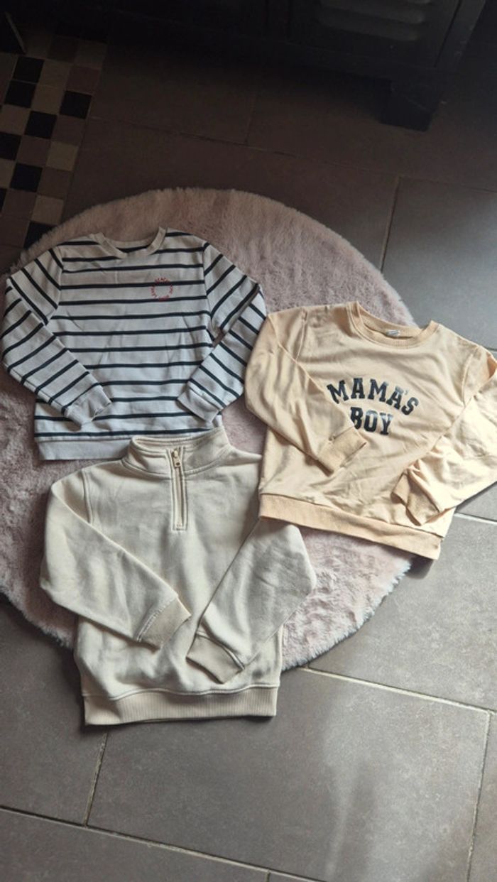 Lot de 3 sweats. 1 beige imprimé noir mama's boy shein 1 imprimé marin blanc/gris et bleu marine kiabi. 1 beige col camionneur Primark. Ont tous un léger défaut, petite tache. Voir photos. Taille 6 ans
