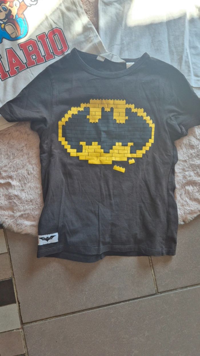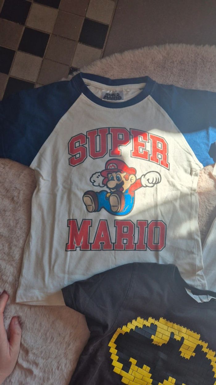 Lot de 3 tee shirts manches courtes en taille 6 ans 1 Super Mario bleu et blanc imprimé. 1 Batman gris foncé et jaune H&M 1 polo blanc avec une broderie turquoise très chic ideal pr fête et cérémonie.