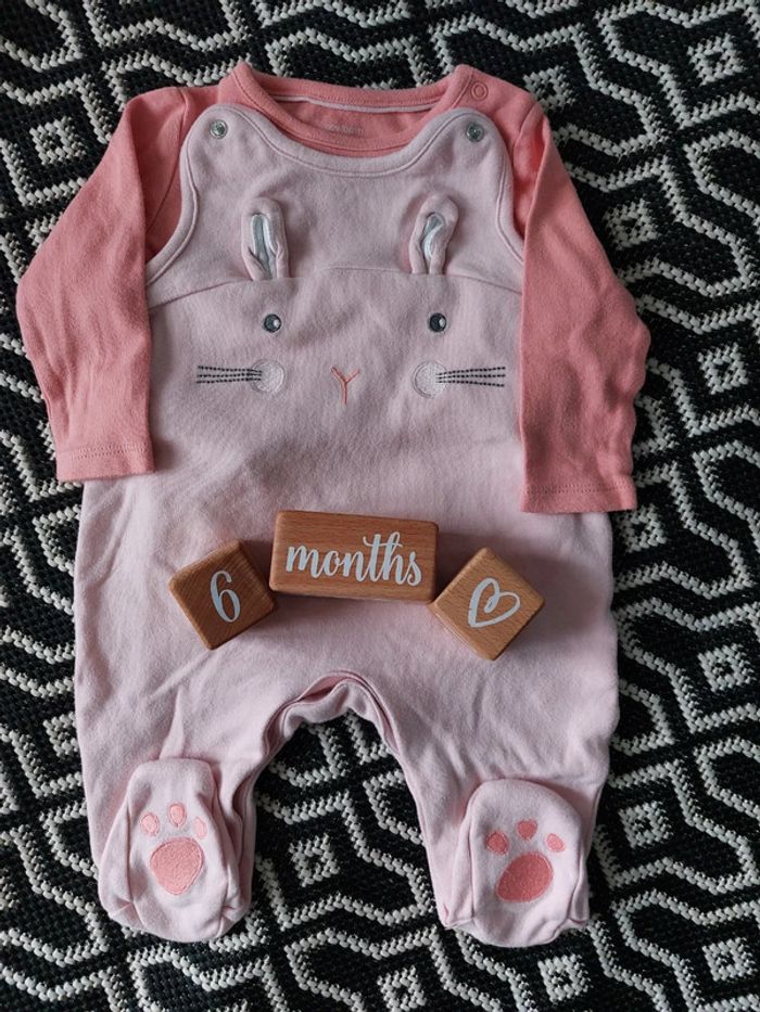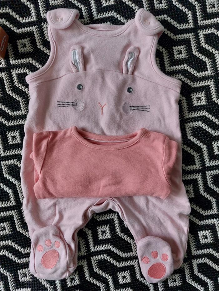 Ensemble C&A en 6 mois, acheté neuf, peu porté, composé d'un pyjama sans manche et du body manche longue assorti. Joli petit lapin sur le devant. Couleur plutôt rose saumon. N'hésitez pas à faire des lots pour bénéficier de réductions j'ai dans mon dressing du bébé fille, bébé garçon, et du mixte.