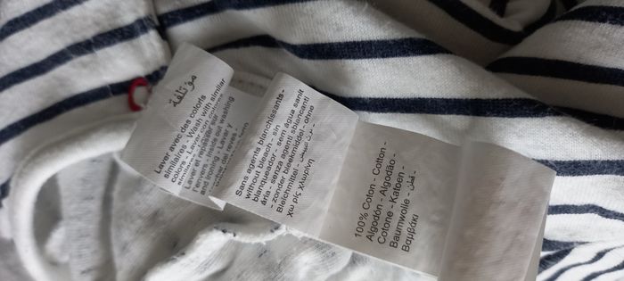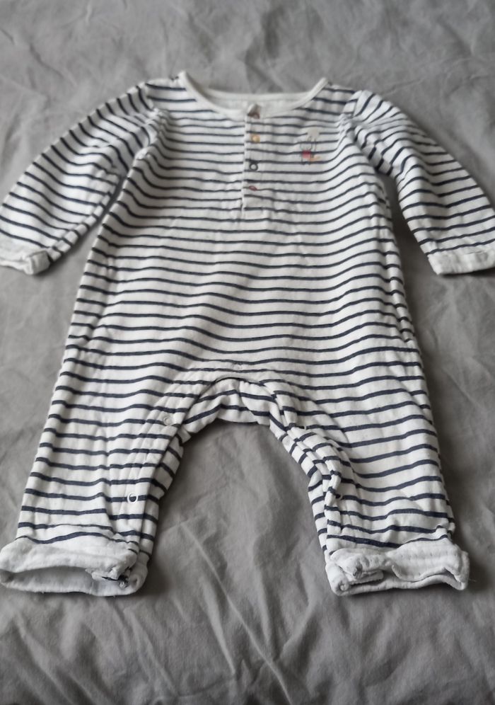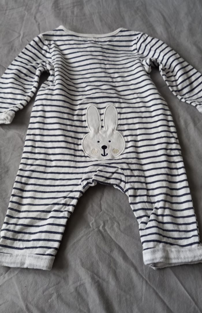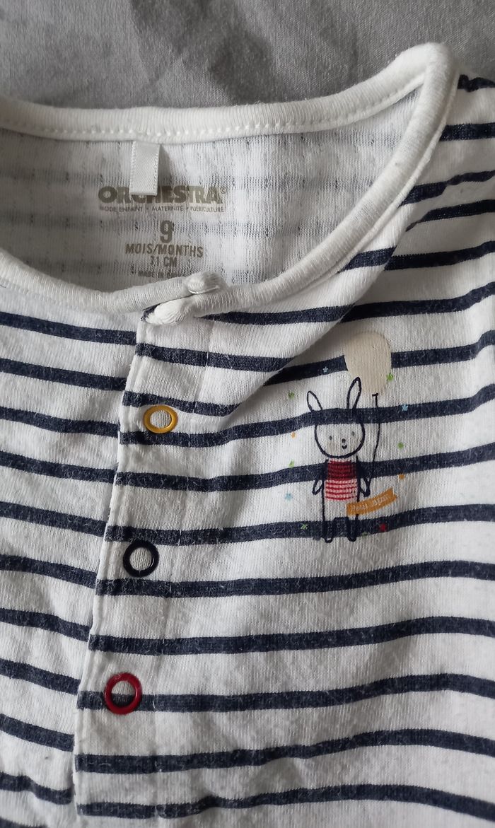 Combinaison Orchestra Coton rayé blanc et bleu Motif lapin poitrine et dos Fermé par pression entrejambe et haut Taille 9 mois #enfants_imoddeco