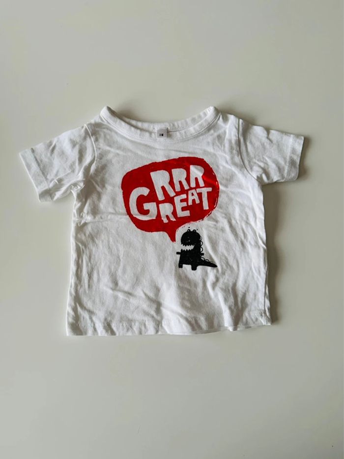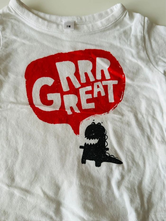 Tee-shirt manches courtes blanc avec petit dessin dinosaure noir et bulles d’écritures rouge. Taille: 3 mois En très bon état. Ni trou, ni tâche. #kuchpix3mois #3moisété #3moisétégarcon #garconete3mois #tshirtmanchescourtes3mois #tshirtmanchescourtes3moisgarcon #hautgarcon3mois