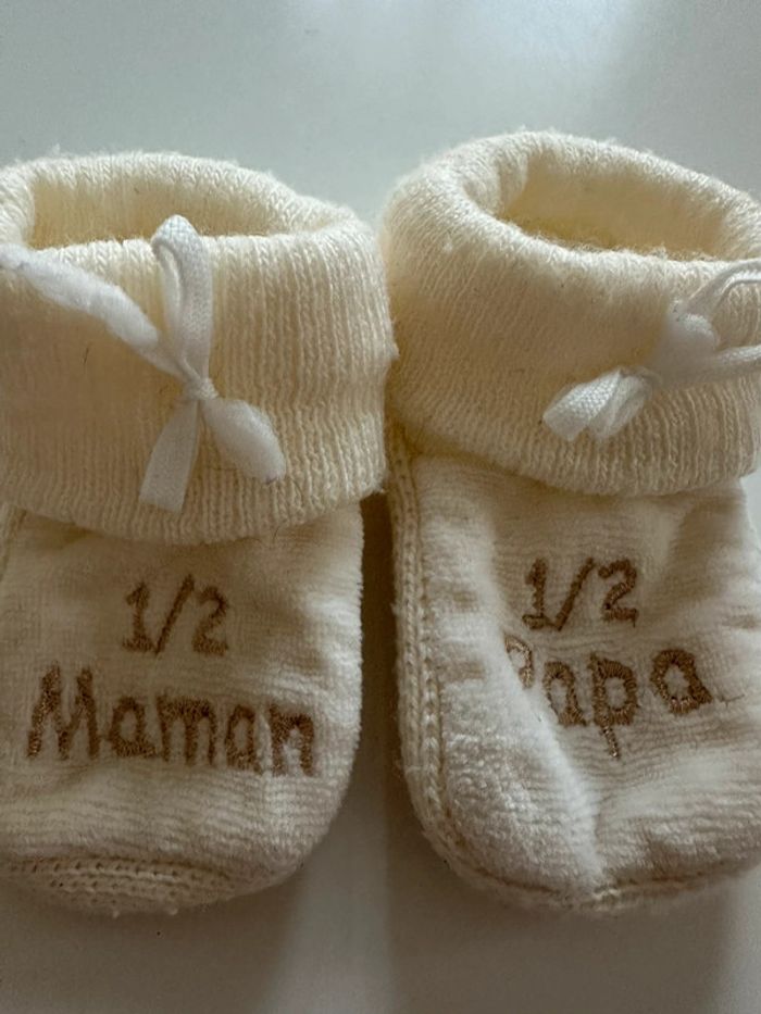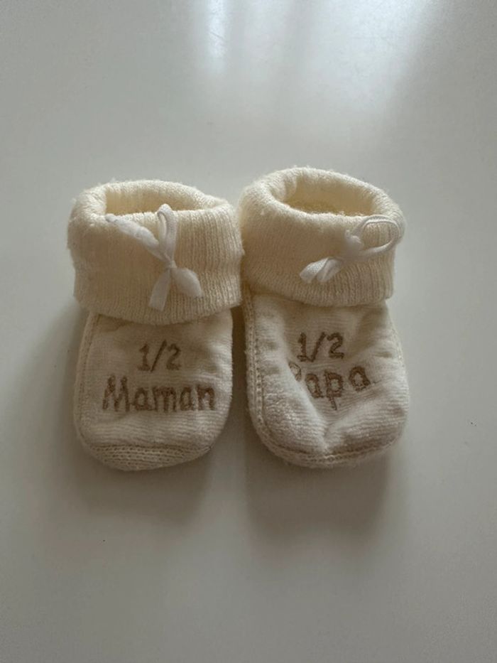 Chaussons de bébé couleur crème avec message « 1/2 maman - 1/2 papa ». Taille: naissance/1 mois En très bon état. Ni trou, ni tâche. #kuchpixnaissance #kuchpix1mois #chaussonsbebe #chaussonsnaissance