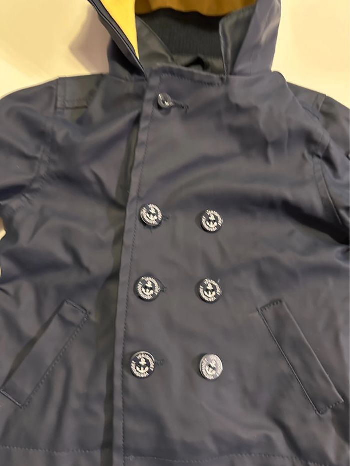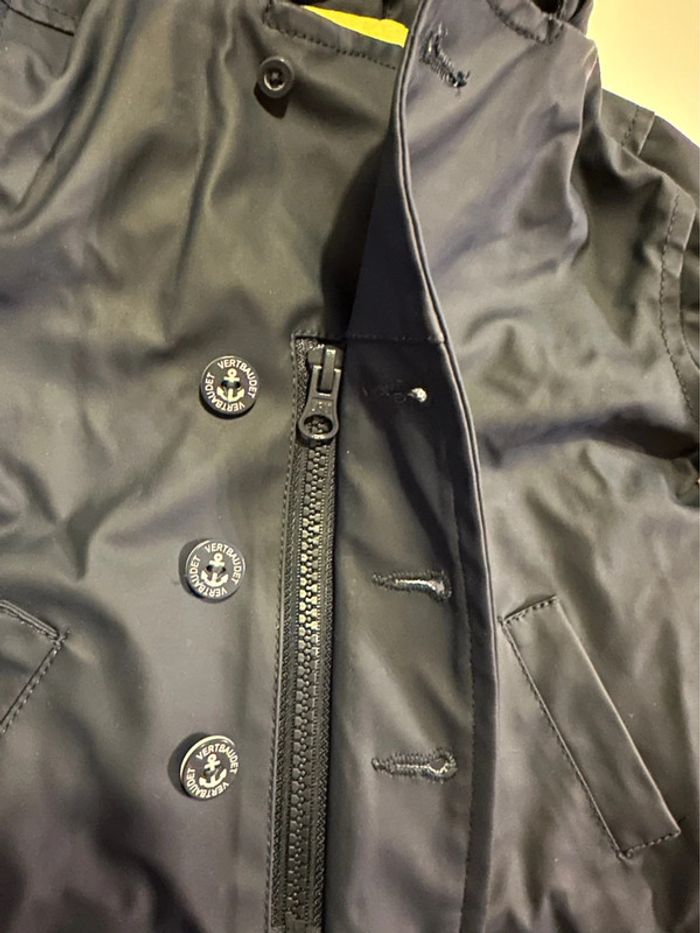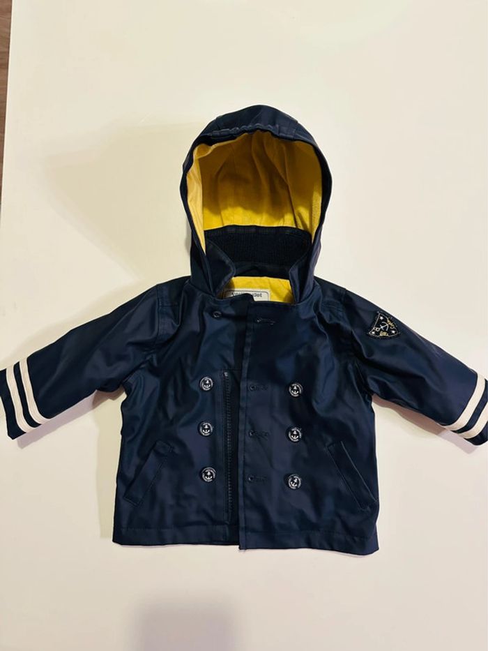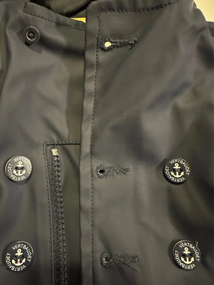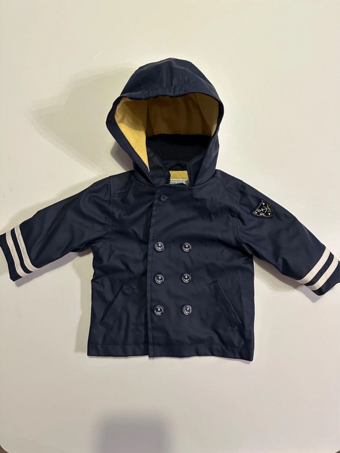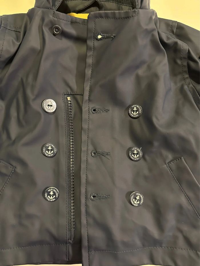 Ciré bleu marine à capuche avec intérieur jaune. Fermeture par zip et boutons. Taille: 6 mois - 67cm Marque: Vertbaudet En bon état (juste quelques fils qui se sont enlevés autour d’un des trous de la boutonnière - ne gêne pas l’utilisation et ne se voit pas lorsqu’il est fermé - voir photos). Ni trou, ni tâche. #kuchpix6mois #cire6mois #impermeable6mois #manteau6mois #manteau6moisgarçon #6moisgarcon #vertbaudet6mois