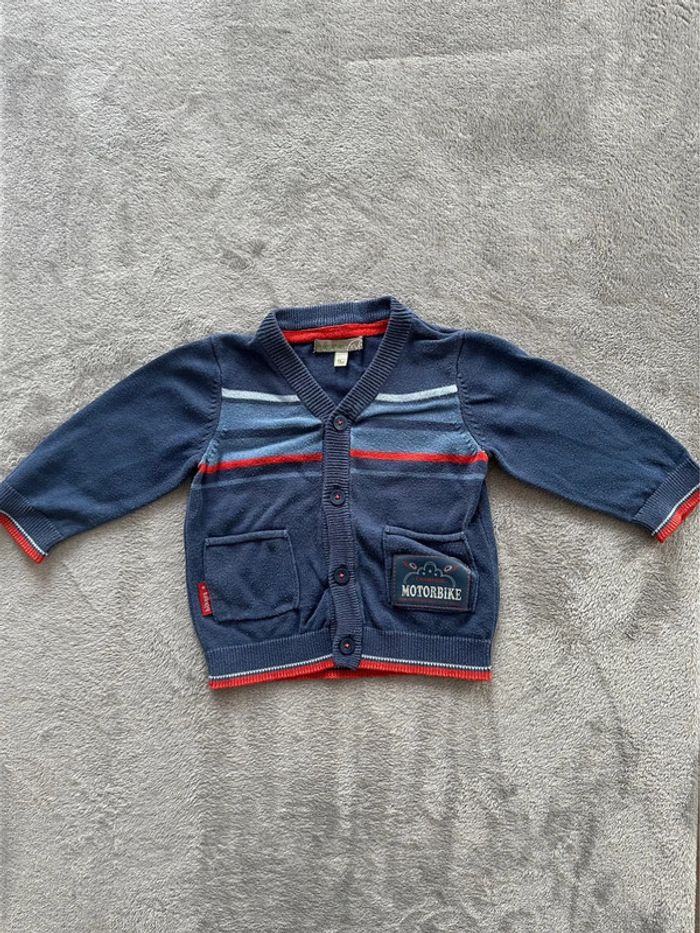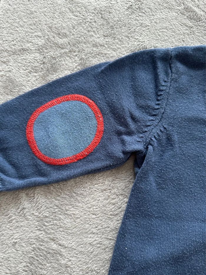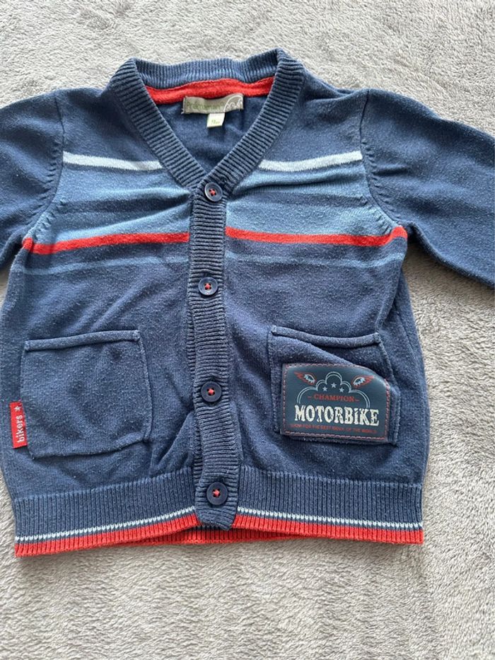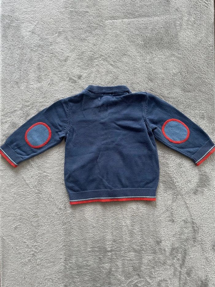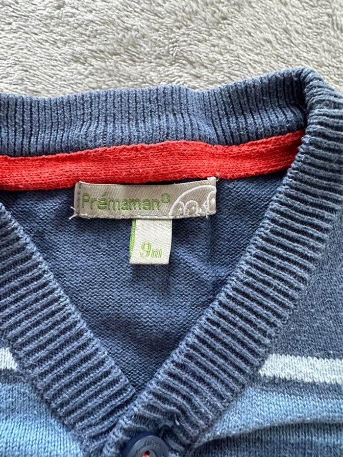Gilet en maille fine dans les tons de bleu et details rouge, avec coudières. Fermeture par boutons. 100% coton Taille: 9 mois - 71 cm Marque: Prémaman Porté mais reste en bon état. Ni trou, ni tâche. Légère décoloration au niveau de la boutonnière (voir photos). #kuchpix9mois #gilet9mois #gilet9moisgarcon #9moisgarcon #premaman9mois