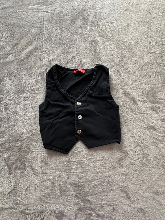 Petit gilet sans manches noir fermé par 3 boutons en métal argenté. Taille : 6 mois Marque : Tissaia Porté mais encore en très état. Ni trou, ni tâche. L’étiquette de composition intérieure a été coupée. #kuchpix6mois #giletsansmanches6mois #giletsansmanches6moisgarcon #tissaia6moisgarcon