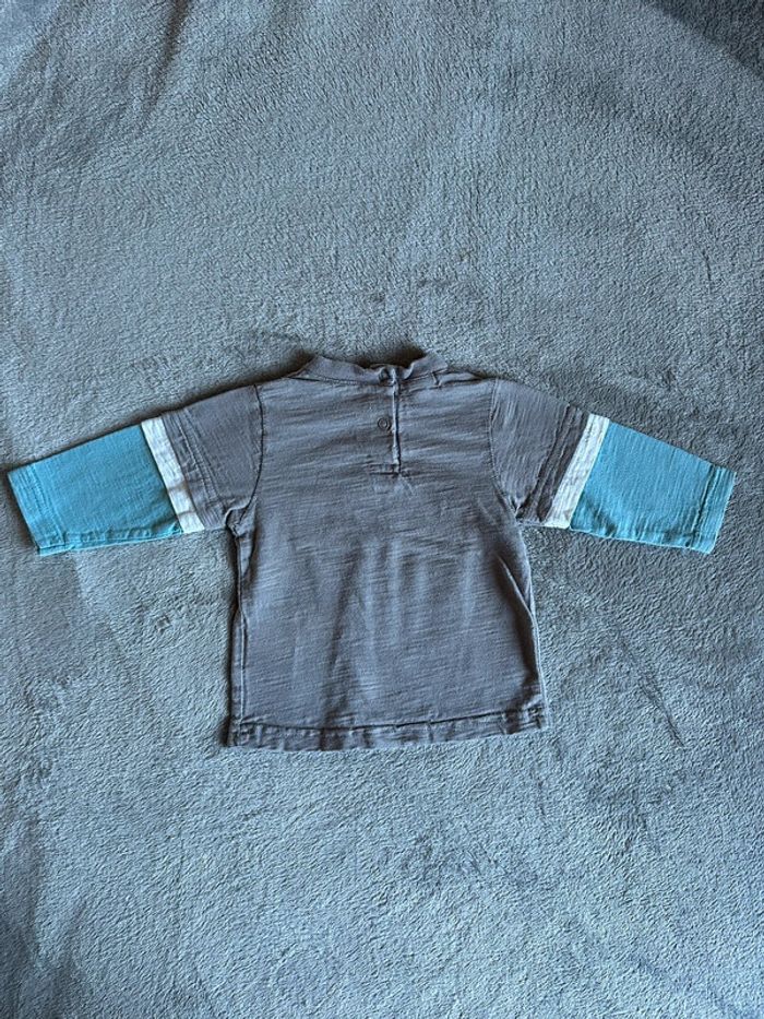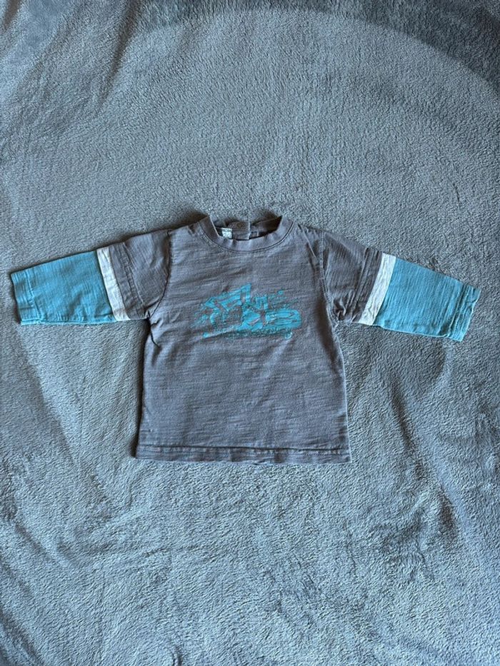 Tee-shirt manches longues garçon de couleur taupe avec manches tricolores (taupe blanc bleu clair). Flocage sur le devant. 2 boutons pressions sur l’arrière pour passage de la tête. 100% coton Taille: 6 mois En bon état (juste le flocage sur le devant qui s’est un peu abîmé >> voir les photos). Ni trou, ni tâche. #kuchpix6mois #6moisgarçon #kimbaloo6mois #kimbaloogarcon6mois #tshirtmancheslongues6mois #tshirtmancheslongues6moisgarcon #tshirtml6moisgarcon