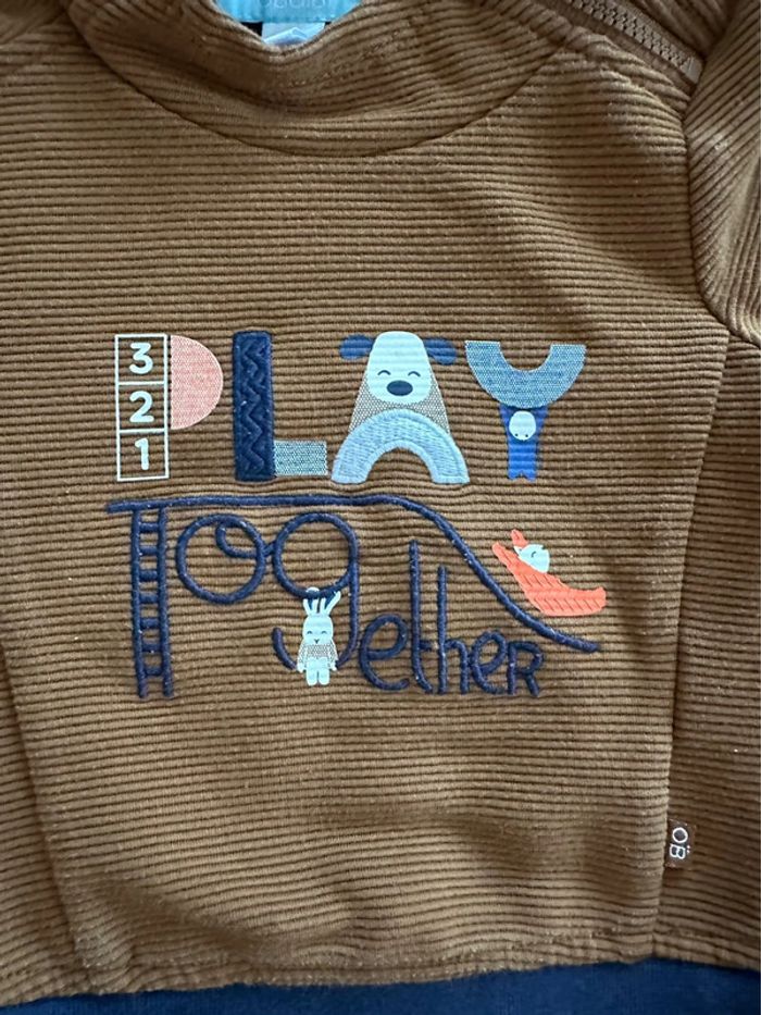Joli ensemble Obaïbi composé de: - un sweat à capuche marron avec motif brodé (dans les tons bleu marine avec touche de corail) Intérieur de la capuche style marinière (rayé bleu marine et blanc). Rappel de bleu marine dans le bas du sweat ainsi qu’au niveau des poignets. Petite fermeture asymétrique au col. - un pantalon marron doublé, style « cargo » avec des poches sur le côté au milieu des jambes. Également 2 petites poches devant et 2 derrières. Taille élastique réglable avec 2 boutons. Fausse ceinture bleu marine et blanche en rappel à l’intérieure de la capuche. Ensemble porté mais encore en très bon état. Ni trou, ni tâche. Taille 3 mois (59cm). #kuchpix3mois #3moisgarcon #3moisensemble #3moisensemblegarcon #3moisensembleobaibi #3moisensembleobaibigarcon #3moisobaibi #3moisobaibigarcon #3moissweat #3moissweatacapuche #3moispantalon #3moispantalongarcon #3moispantalongarcondouble #3moispantalonobaibi #obaïbigarcon #obaibi #obaibi3mois #obaibi3moisgarcon #obaibi3moisensemble #obaibi3moisensemblegarcon #ensemblegarçon #ensemblegarcon3mois #ensemblegarçon3moisobaibi #garcon3mois #garçon3moisobaïbi #garcon3moisobaibi