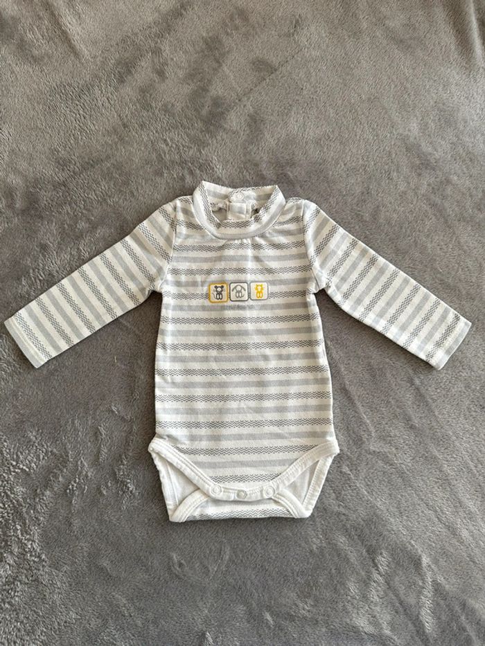 Body hiver avec manches longues et col de couleur blanc cassé avec des rayures à motifs de couleur grise et des petits imprimés gris et jaunes sur le devant. Ouverture par 3 boutons pressions dans le dos. Le body est neuf, il n’a jamais été porté, juste lavé. En revanche l’étiquette intérieure indiquant la composition a été découpée et il y a des initiales au stylo à l’intérieur (voir photos). #kuchpix1mois #1moisgarçon #1mois #body1moisgarcon #body1mois #bodyhiver1mois #obaibigarcon1mois #obaibi1mois #obaibi1moisgarcon #bodyobaibi1mois #bodies1moisgarcon #bodies1mois