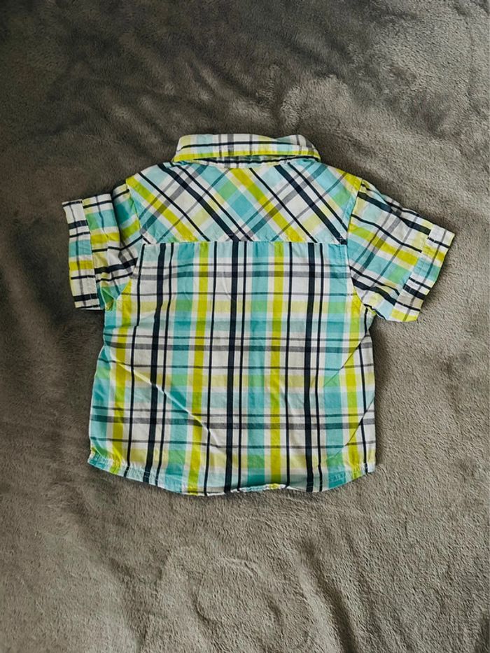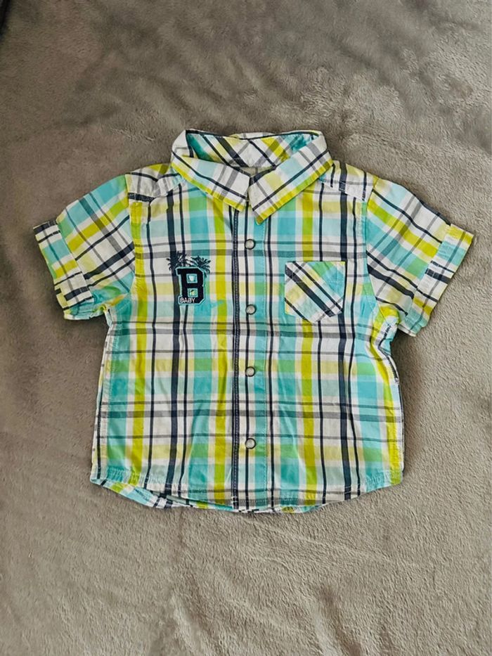 Chemisette à carreaux dans les tons blancs, turquoises, verts et gris avec une petite poche sur la poitrine. Ouverture par boutons pressions. En 100% coton. État impeccable, très peu porté. #kuchpix1mois #1moisgarçon #1mois