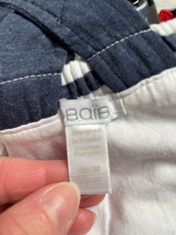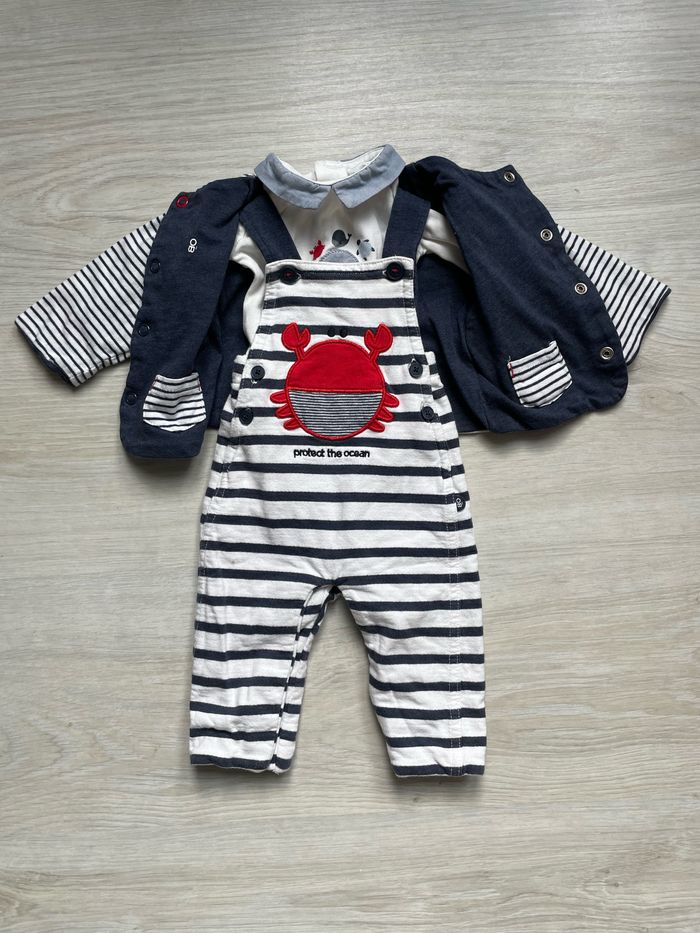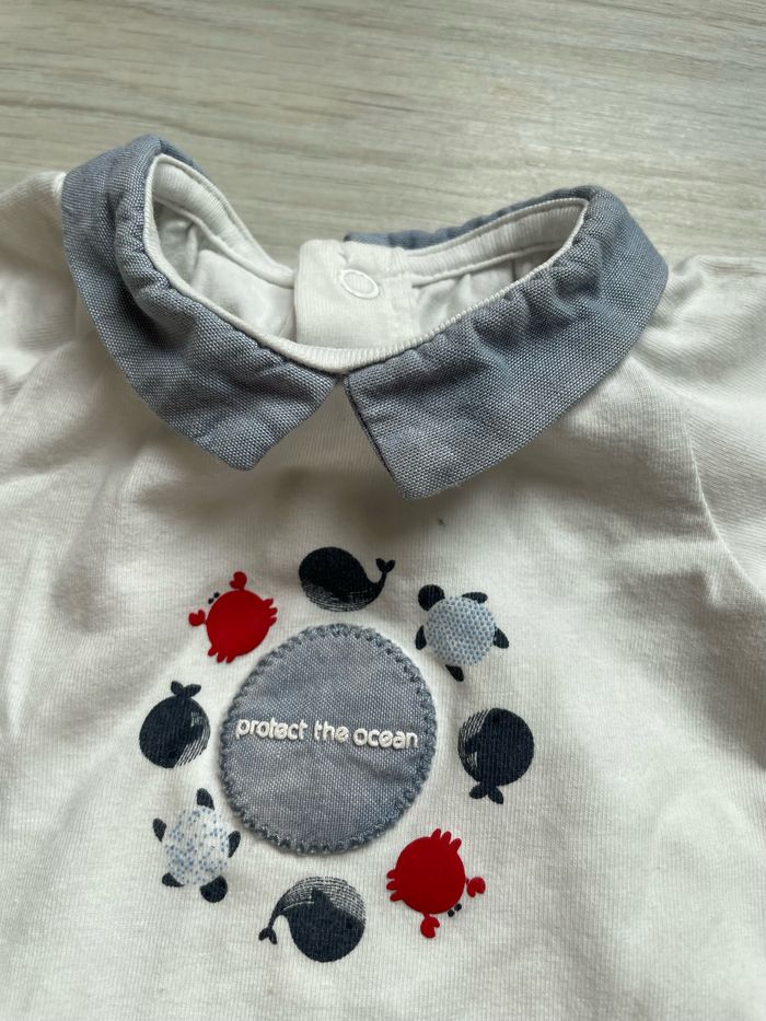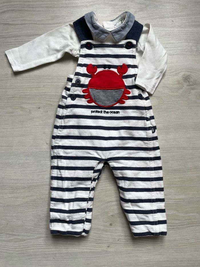 Thème « crabe » Veste en parfait état, aucun défaut Salopette en très bon état. A déjà été portée (présence de légères bouloches sur les bretelles) Body pas troué ni taché mais le col est légèrement décoloré et le patch « protect the océan » l’est vraiment, je ne le compte pas dans le tarif Même prix Idtroc