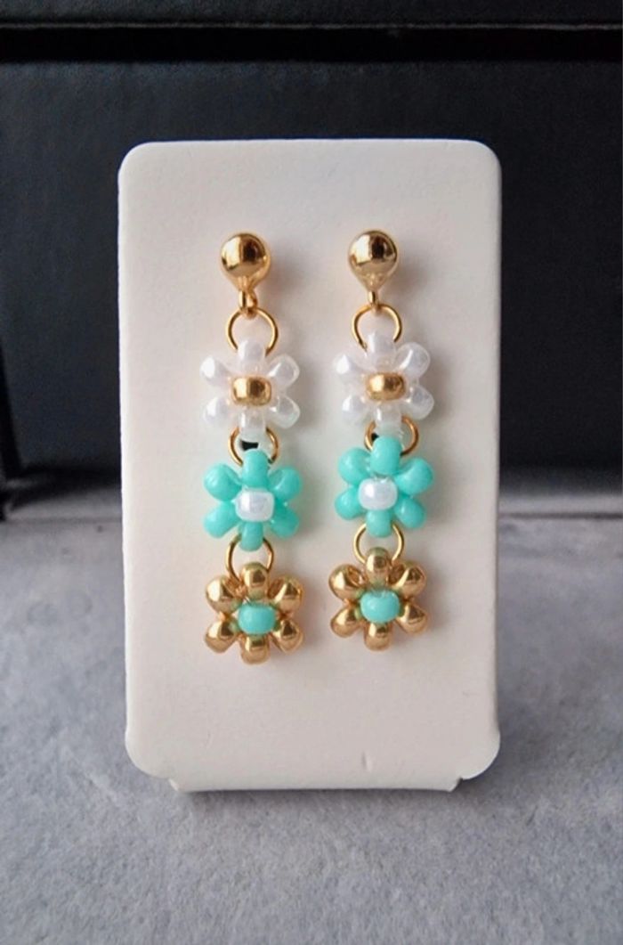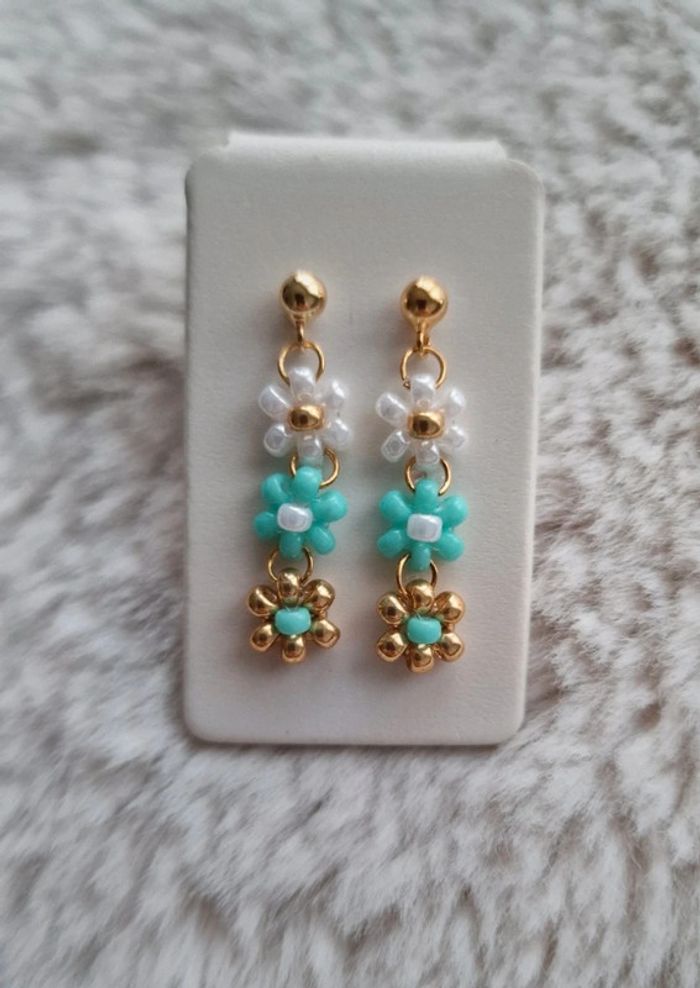 Boucles d'oreilles 3 fleurs Blanc nacré, vert d'eau et doré Marque Crystalia Perles comme neuf Taille 2,5cm #boucledoreilles #fleurs #bouclesdoreillesfleurs #perles&co #doré #été