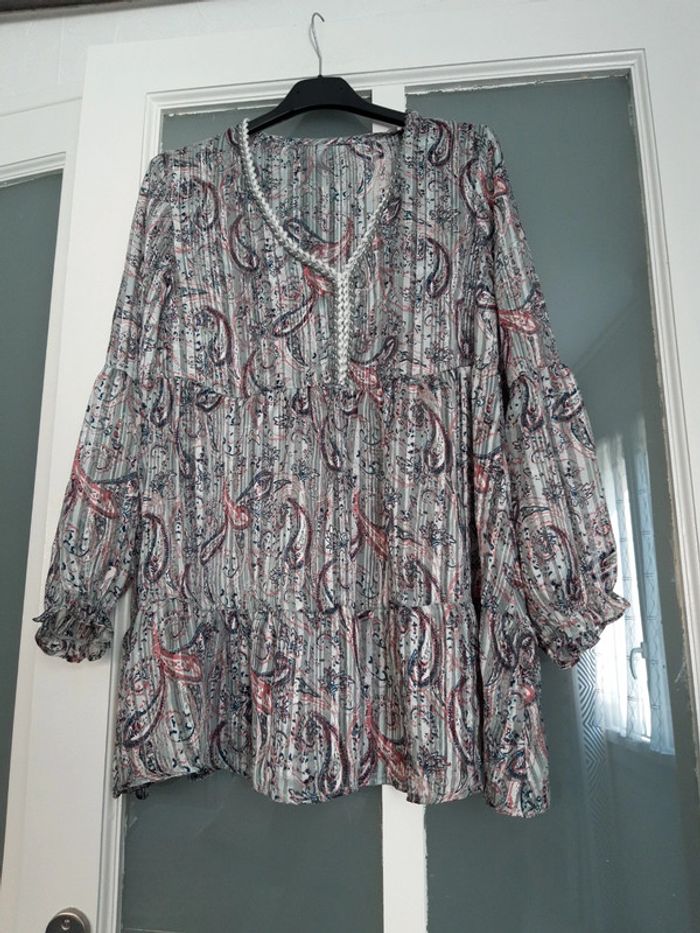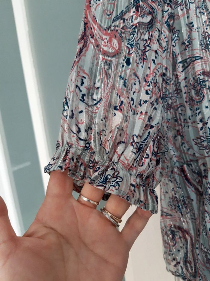 Liquette blouse fluide légère à volants gris argent et motifs Taille 38 Aisselles à aisselles 47 cm Longueur 69 cm #sevileano_blouses