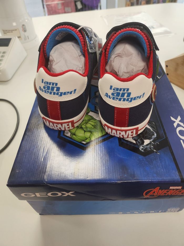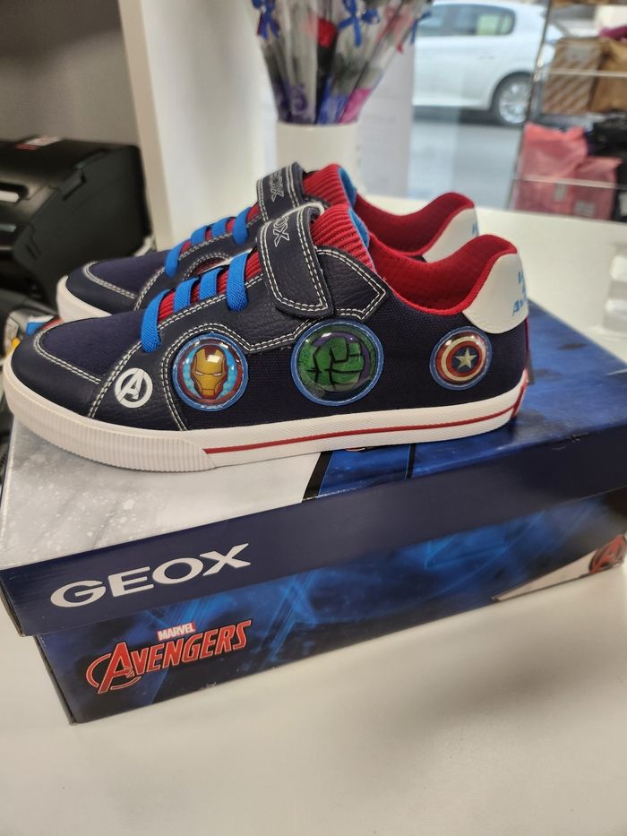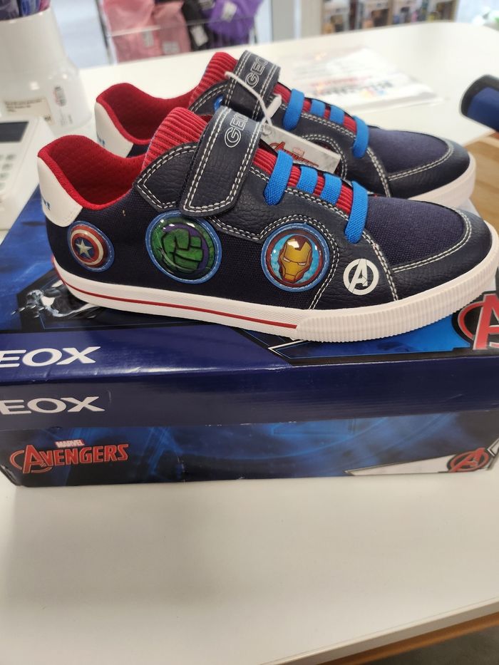 Sneakers basses junior légères et respirantes, dédiées aux super héros Marvel. Sneakers basses junior légères et respirantes, dédiées aux super héros Marvel. La tige bleu marine avec des touches de rouge présente des patchs ronds en 3D où figurent quelques-uns des personnages emblématiques des Avengers : Hulk, Iron Man et Captain America. Réalisées en toile et matière à effet cuir foulonné, les Kilwi sont un modèle décontracté et amusant, avec des lacets élastiques et une fermeture à scratch.