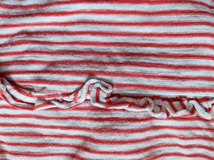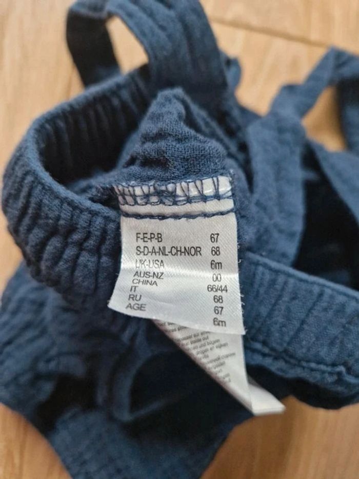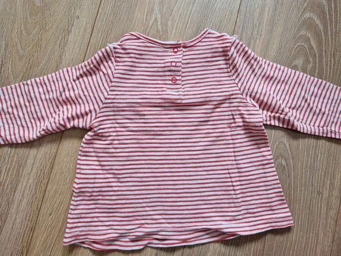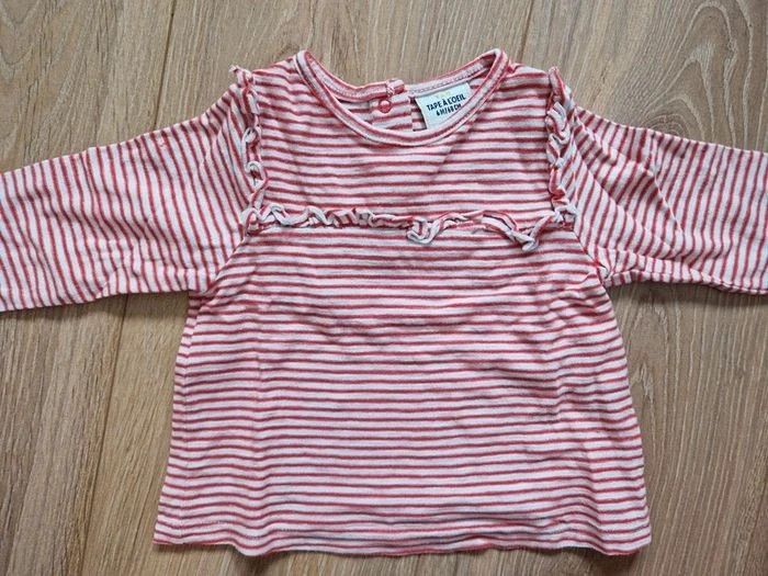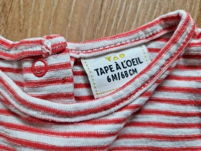 Ensemble fille composé : d'un tee-shirt manches longues TAO 68 cm rouge blanc rayé avec pressions dans le dos d'un short La redoute bleu marine 67 cm avec bretelles croisées ajustables. #sarahzajacfille6m #szbebe #sz6m #szcarde
