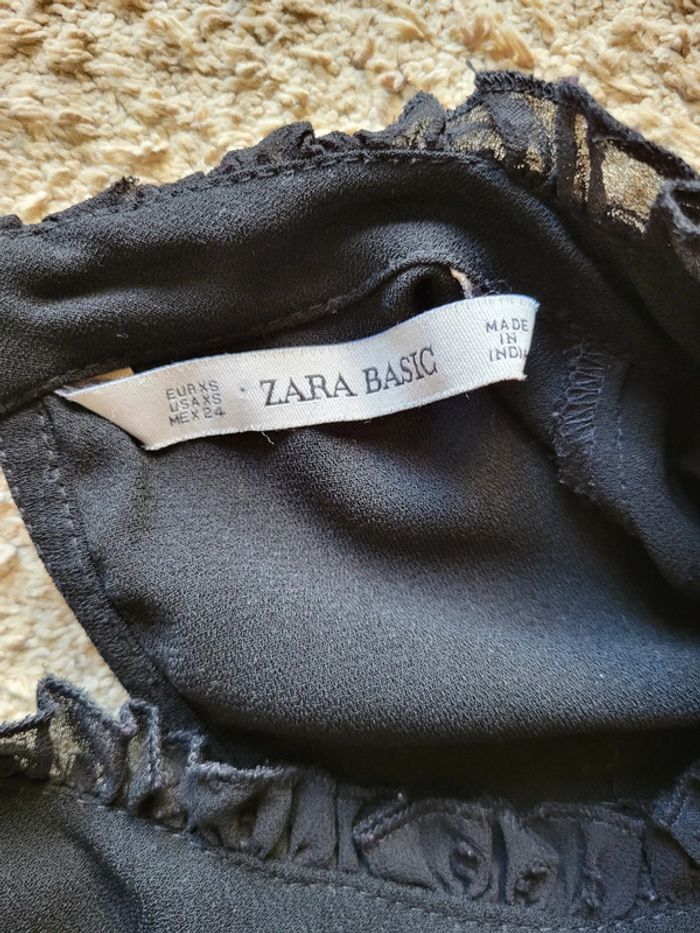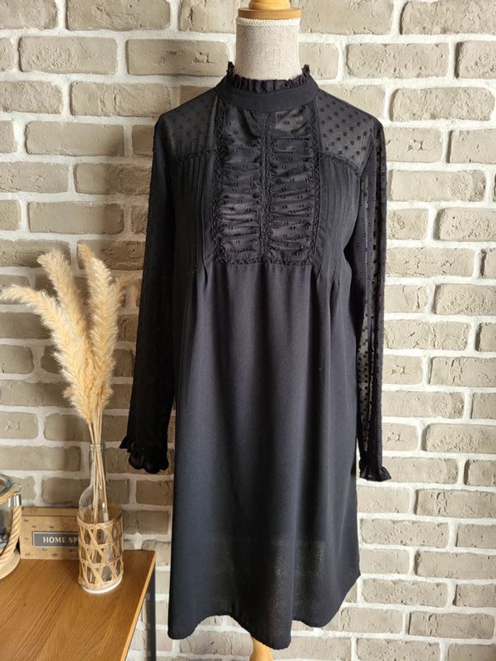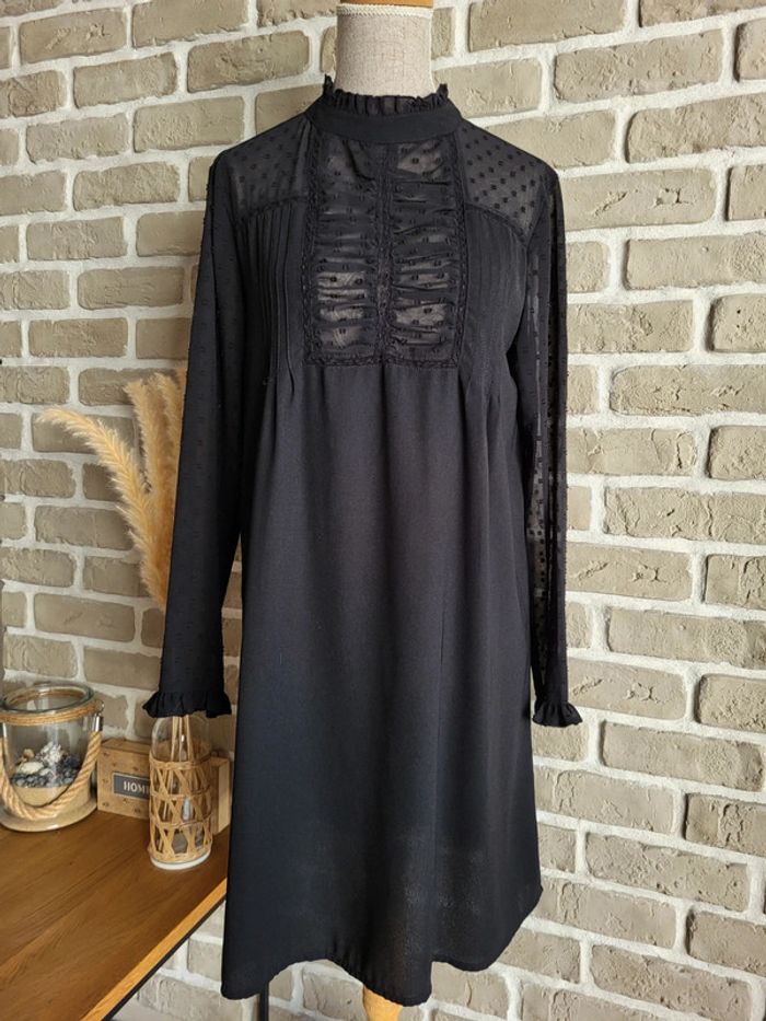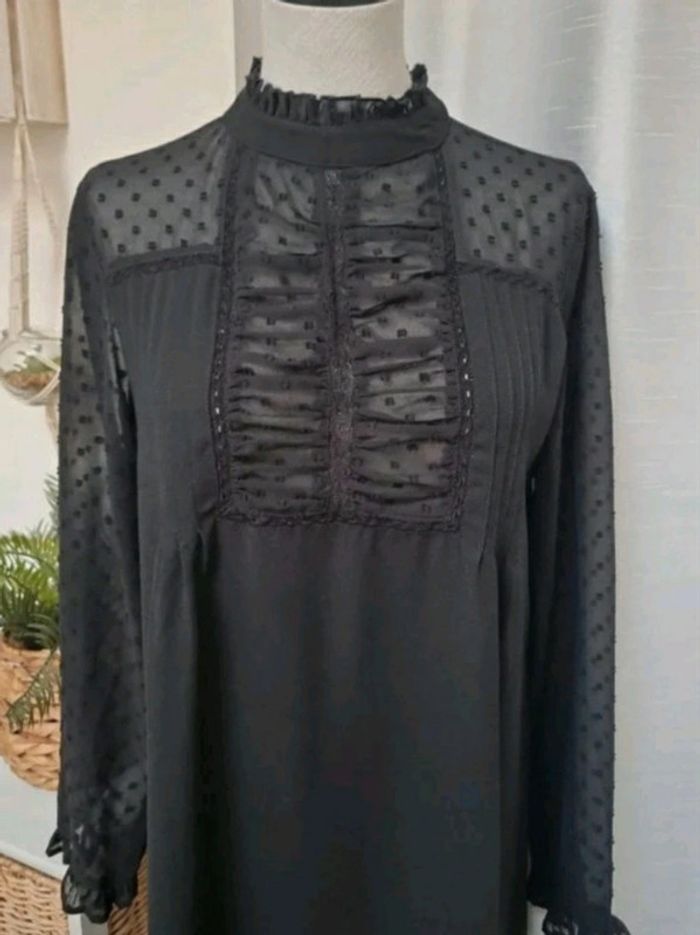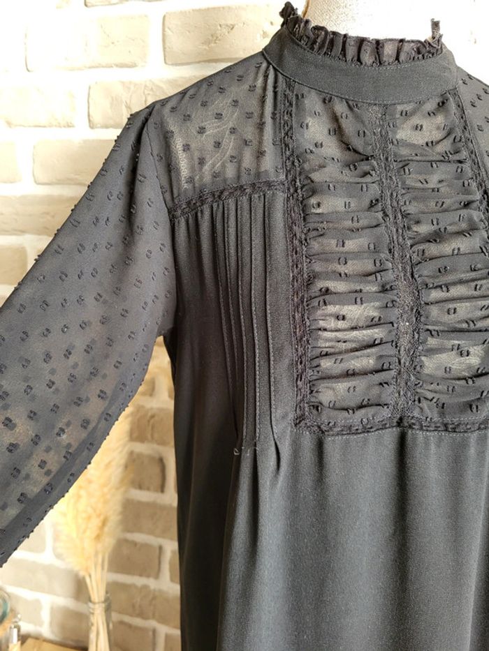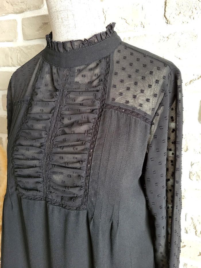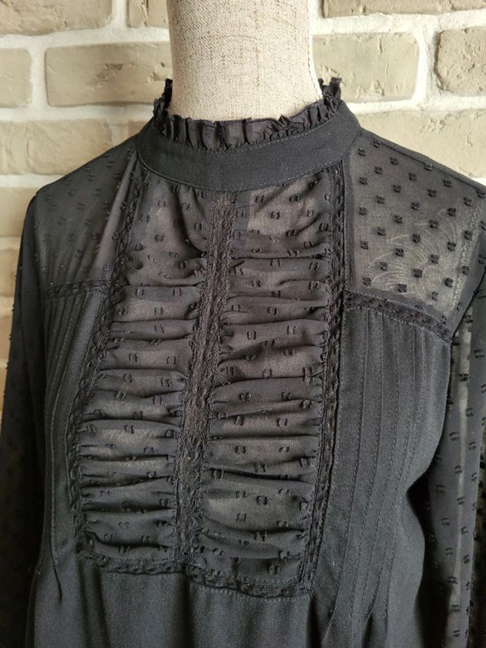 . Jolie robe noire Zara en très bon état, sans défaut . Jeu de transparence aux manches, aux épaules et au col avec des plumetis, des fronces, de la dentelle et des petits volants . Le reste de la robe est opaque et fluide . Ouverture par un petit bouton dans la nuque . Taille XS 34 Longueur : 87 cm 🌸 Et si vous alliez faire un tour dans dressing ? Les réductions sur les lots sont activées 🩷 Bohème