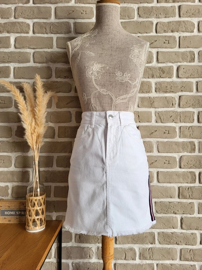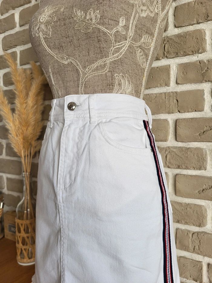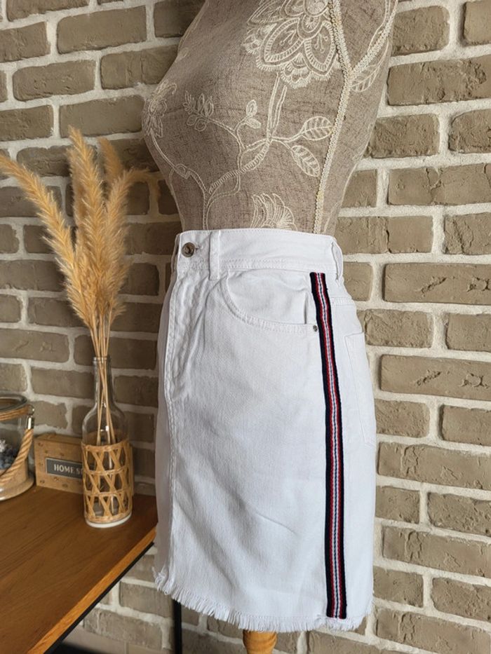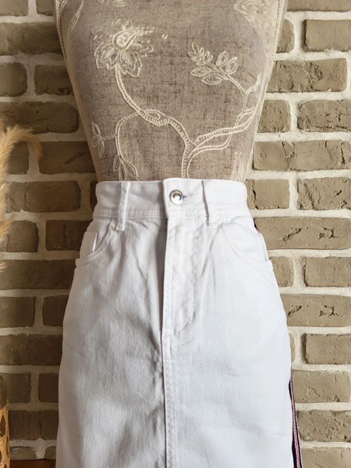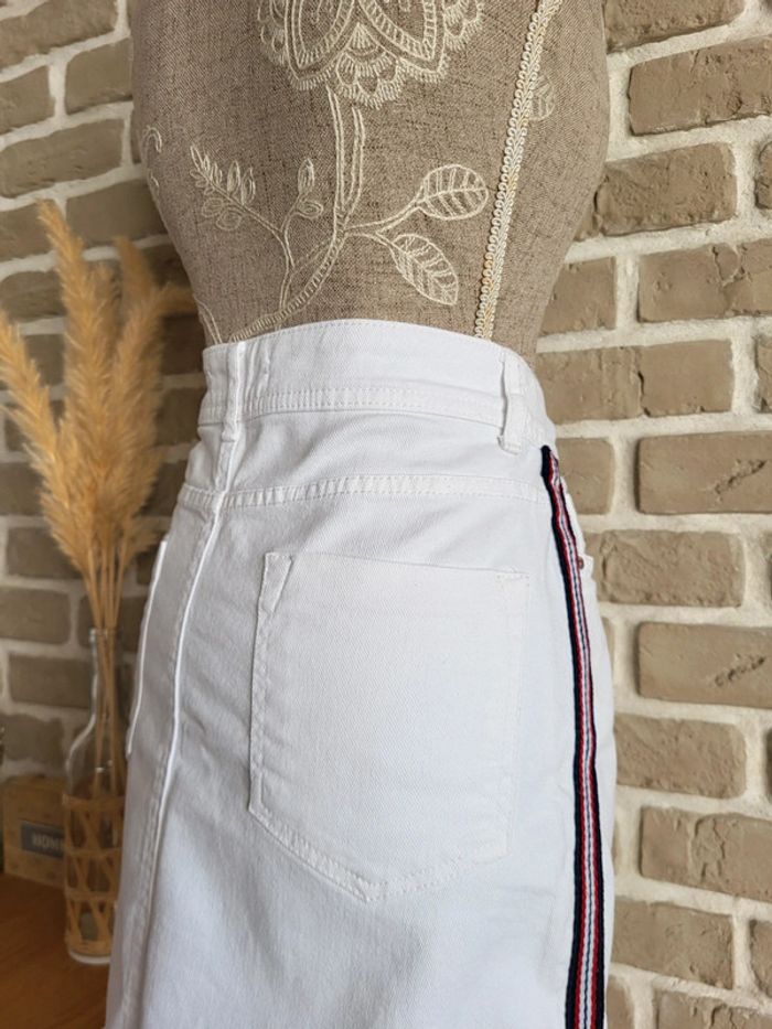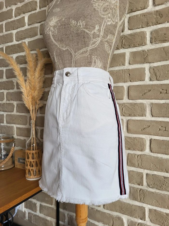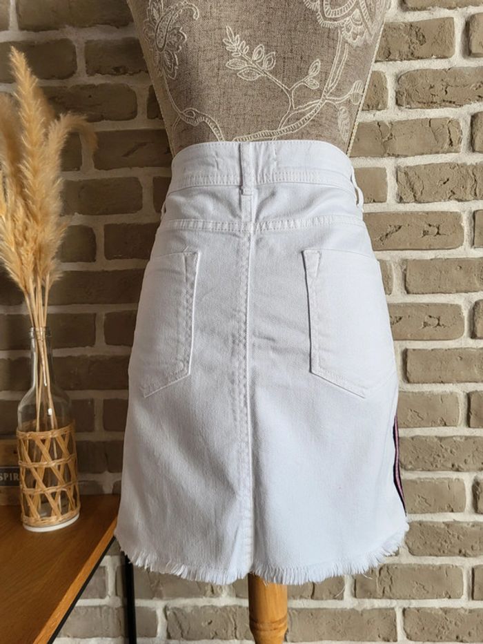 . Jupe en jean blanc, très peu portée donc en parfait état . Bandes latérales et franges en bas . Taille S 36 Largeur à la taille : 34 cm Longueur : 42 cm 🌸 Et si vous alliez faire un tour dans dressing ? Les réductions sur les lots sont activées 🩷 Mode
