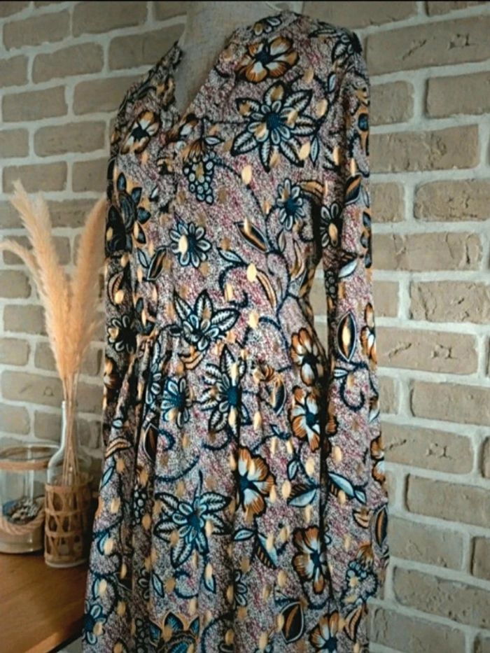 . Robe à manches longues avec imprimé floral et petites feuilles dorées en parfait état, proche du neuf . Elle est très fluide et légère, très agréable à porter . Col et manches boutonnés, fronces à la taille . Lille Rose, taille M 38 🌸 Et si vous alliez faire un tour dans dressing ? Les réductions sur les lots sont activées 🩷 Casual Chic Soirée Féminin