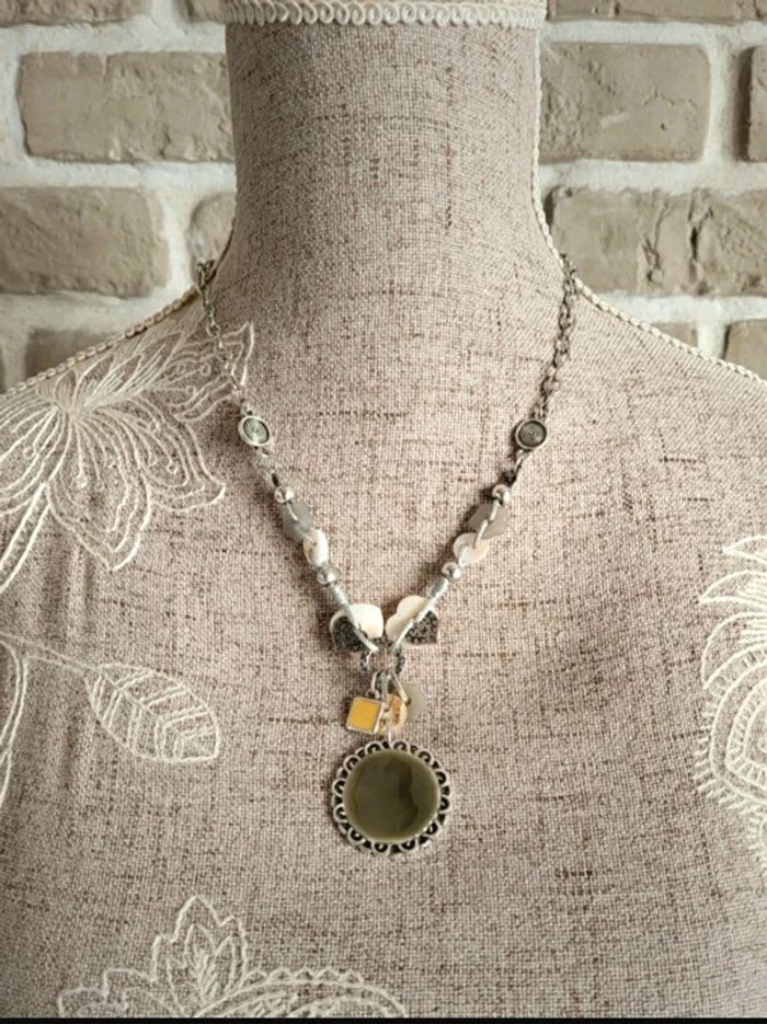 . Collier fantaisie avec chaîne argentée, perles et breloques montées sur un lien gris . Etat neuf, jamais porté . Couleurs douces et nacrées . Longueur totale : 47 cm + 7 cm de chaînette d'ajustement 🌸 Et si vous alliez faire un tour dans mon dressing ? Les réductions sur les lots sont activées 🩷 Romantique Féminin