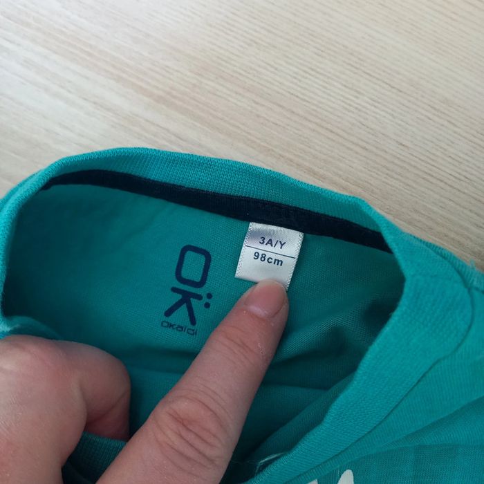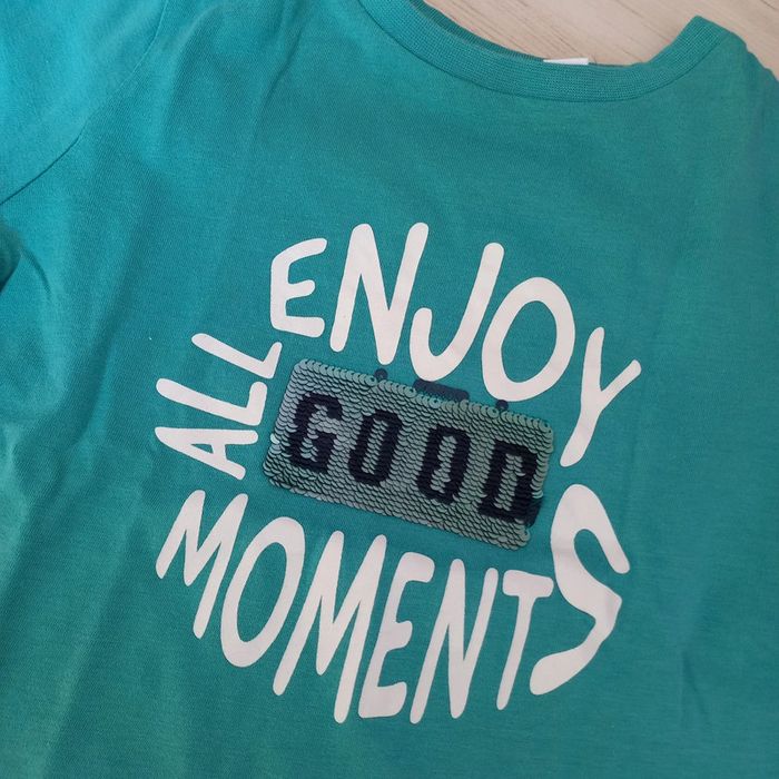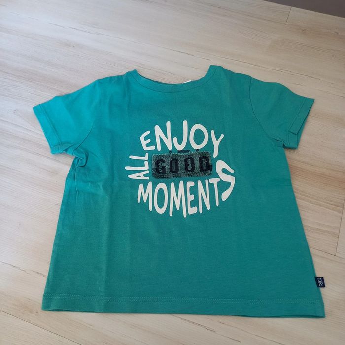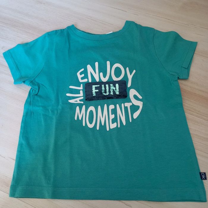 Tee shirt turquoise avec écriture banche et sequins Neuf sans etiquette jamais porté Taille 3ans Okaidi