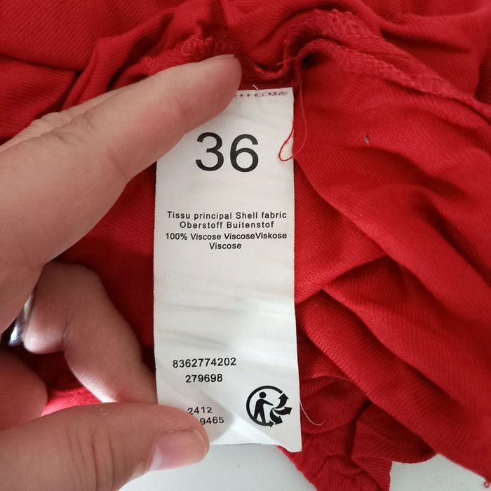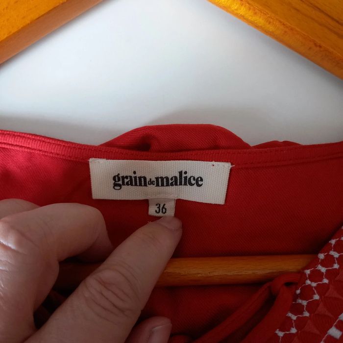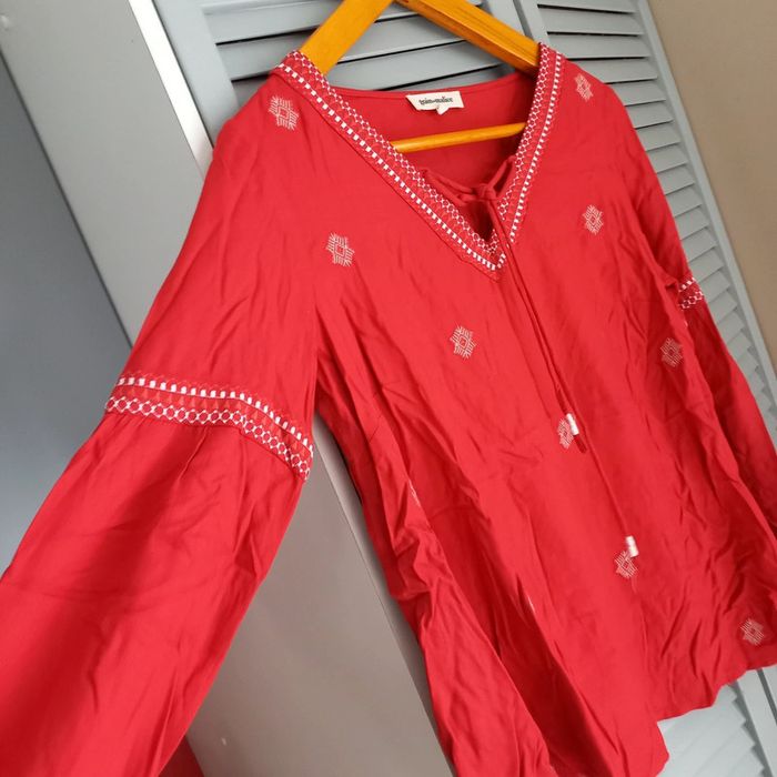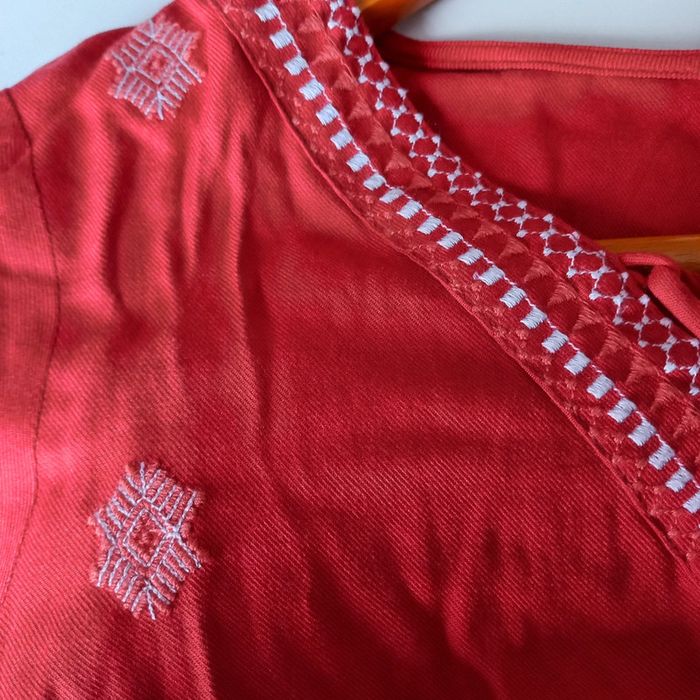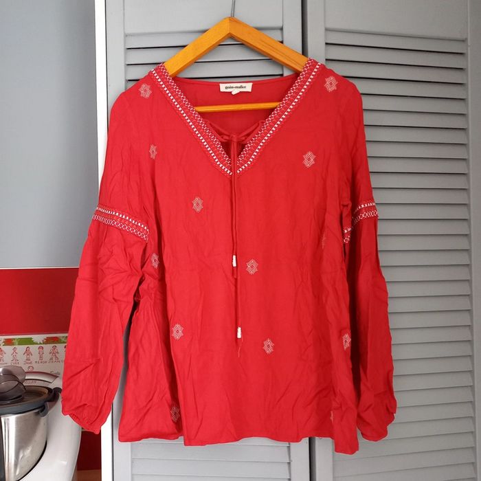 Blouse bohème rouge avec motifs blancs brodés Col v avec noeud Grain de malice Taille 36