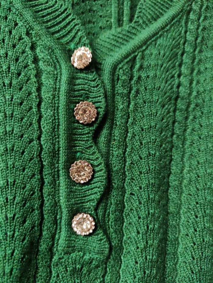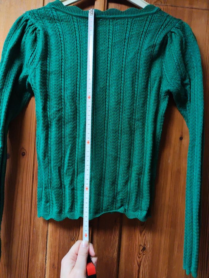 Pull vert sapin bouton décoratif devant, jolie maille marque kilky étiquette M/L je dirai plus S/M cf mesure photo, il est prêt du corps