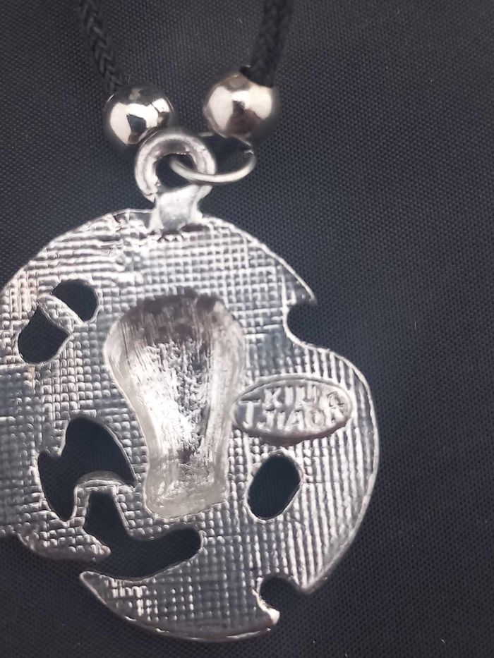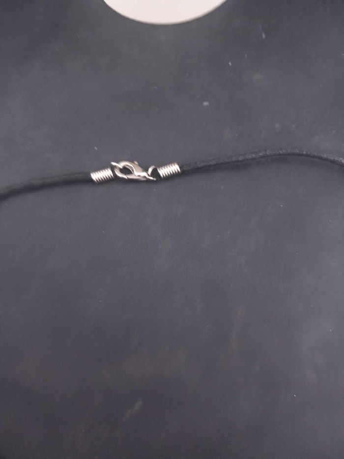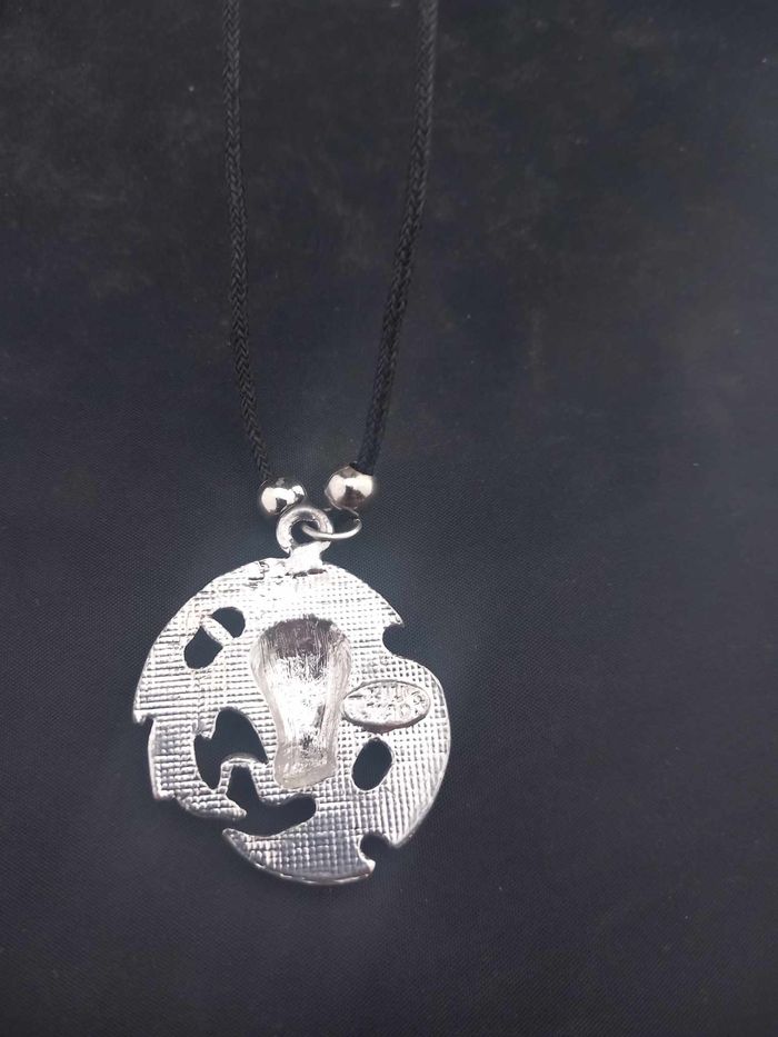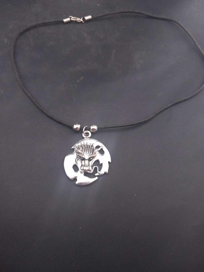 Collier avec pendentif homme Matières métal et cordon Forme rond avec tête de dragon Couleurs argenté et noir En très bon état Dimensions approximative collier 45cm de long détacher - Pendentif 4cm de long : 3cm de large