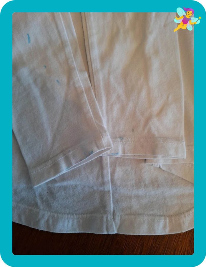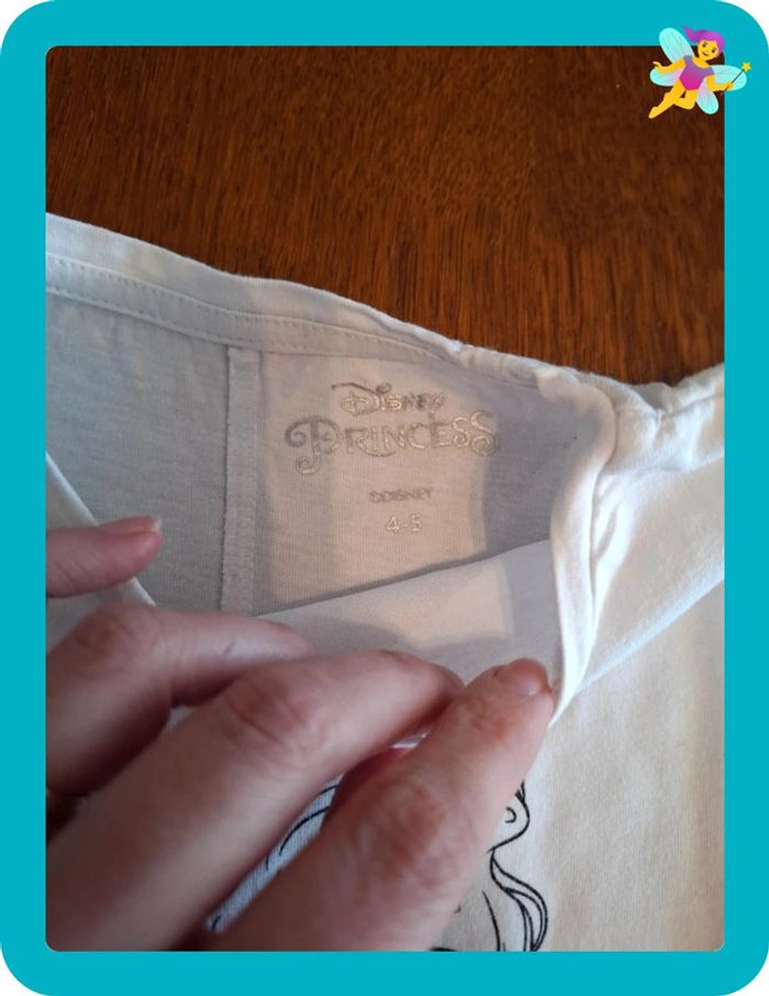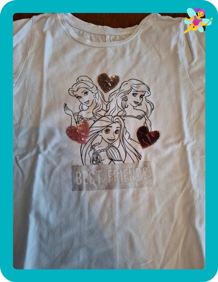 T-shirt disney princesses 4-5 ans. Petites traces de feutre bleu sur une manche. Et plusieurs traces sur le bout des manches. Voir photo et une toute petite tâche orange dans le dos. Ne se voit presque pas. #sophiebouet4ans #sophiebouet5ans #tshirtdisney #tshirtdisney4ans #tshirtdisney5ans